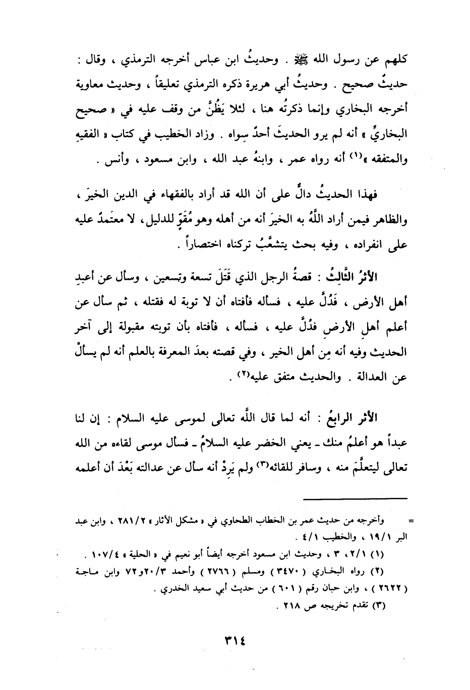الأثرُ الثَّالِثُ: قصةُ الرجل الذي قَتَلَ تسعة وتسعين، وسأل عن أعبدِ أهل الأرض، فَدُلَّ عليه، فسأله فأفتاه أن لا توبة له فقتله، ثم سأل عن أعلم أهلِ الأرضِ فدُلَّ عليه، فسأله، فأفتاه بأن توبته مقبولة إلى آخر الحديث وفيه أنه من أهل الخير، وفي قصته بعدَ المعرفة بالعلم أنه لم يسألْ عن العدالة. والحديث متفق عليه (¬2).