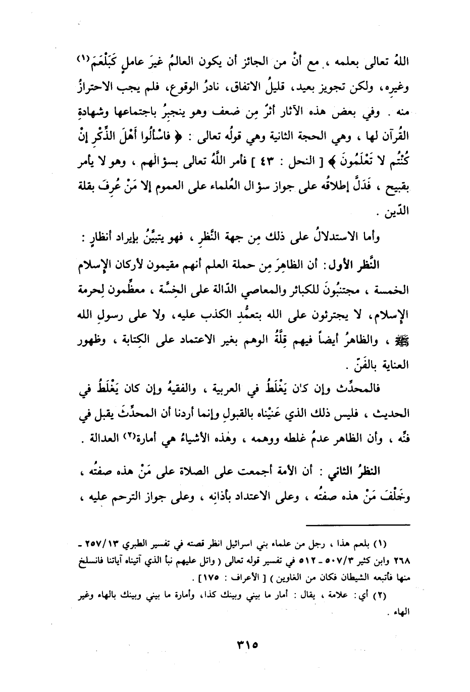 اللهُ تعالى بعلمه، مع أنَّ من الجائز أن يكون العالمُ غيرَ عامل كَبَلْعَمَ (¬1) وغيرِه، ولكن تجويز بعيد، قليلُ الاتفاق، نادرُ الوقوع، فلم يجب الاحترازُ منه. وفي بعض هذه الآثار أثرٌ مِن ضعف وهو ينجبِرُ باجتماعها وشهادةِ القُرآن لها، وهي الحجة الثانية وهي قولُه تعالى: {فَاسْأَلُوا أَهْلَ الذِّكْرِ إِنْ كُنْتُمْ لَا تَعْلَمُونَ} [النحل: 43] فأمر اللهُ تعالى بسؤالهم، وهو لا يأمر بقبيح، فَدَلَّ إطلاقُه على جواز سؤال العُلماء على العموم إلا مَنْ عُرِفَ بقلة الدِّين.
