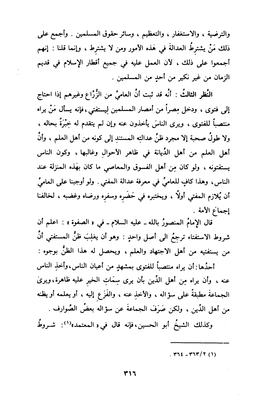 النَّظر الثالث: أنَّه قد ثبت أنَّ العاميَّ من الزُّرَّاع وغيرهم إذا احتاج إلى فتوى، ودخل مِصراً من أمصار المسلمين لِيستفتي، فإنه يسأل مَنْ يراه منتصباً للفتوى، ويرى الناسَ يأخذون عنه وإن لم يتقدم له خِبْرةٌ بحاله، ولا طولُ صحبة إلا مجرد ظنِّ عدالته المستندِ إلى كونه من أهل العلم، وأنَّ أهل العلم من أهل الدِّيانة في ظاهر الأحوالِ وغالبها، وكون الناس يستفتونه، ولو كان مِن أهل الفسوق والمعاصي ما كان بهذه المنزلة عند الناس، وهذا كافٍ للعاميِّ في معرفة عدالة المفتي. ولو أوجبنا على العاميِّ أن يُلازم المفتي أولاً، ويختبره في حَضَرِه وسفرِه ورضاه وغضبه، لخالفنا إجماعَ الأمة.