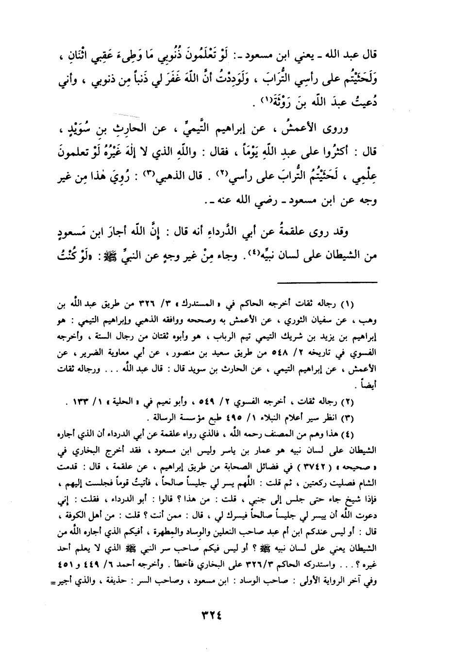 وروى الأعمشُ، عن إبراهيم التَّيميِّ، عن الحارثِ بنِ سُوَيْدٍ، قال: أكثرُوا على عبدِ الله يَوْمًا، فقال: والله الذي لا إلهَ غَيْرُهُ لوْ تعلمون عِلْمِي، لَحَثيْتُمُ التُّرابَ على رأسي (¬2). قال الذهبي (¬3): رُوِيَ هذا مِن غير وجه عن ابن مسعود -رضي الله عنه-.