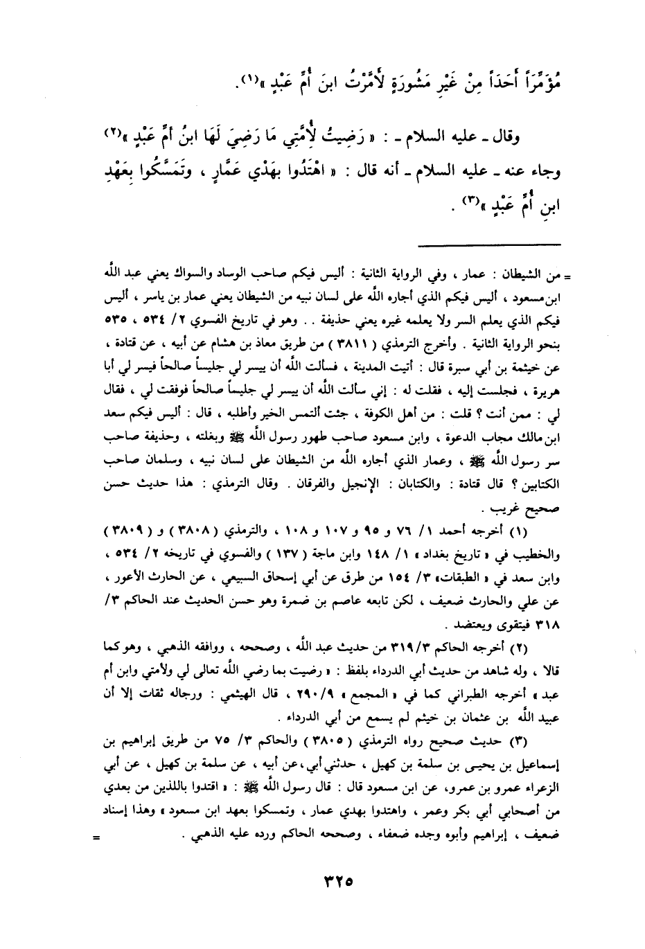 وقال -عليه السلام-: " رضِيتُ لأُمَّتِي مَا رَضِيَ لَهَا ابنُ أمِّ عَبْدٍ " (¬2) وجاء عنه -عليه السلام- أنه قال: " اهْتَدُوا بهَدْي عَمَّار، وتَمَسكوا بعَهْدِ ابنِ أُمِّ عَبْدٍ " (¬3).