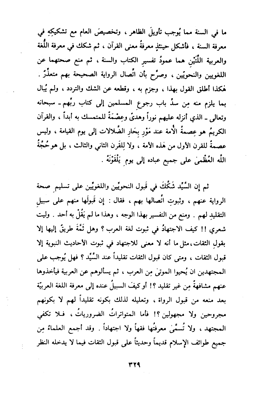 ثم إن السَّيِّد شَكَّكَ في قبول النحويِّين واللغويِّين على تسليمِ صحة الرواية عنهم، وثبوتِ اتِّصالها بهم، فقال: إن قَبولَها منهم على سبيلِ التقليدِ لهم. ومنع من التفسير بهذا الوجه، وهذا ما لم يَقُلْ به أحد. وليت شعري!! كيف الاجتهادُ في ثبوت لغة العرب؟ وهل ثَمَّة طريقٌ إليها إلا بقولِ الثقات، مثل ما أنه لا معنى للاجتهاد في ثبوت الأحاديث النبوية إلا قبول الثقات، ومتى كان قبول الثقات تقليداً عند السَّيِّد، فهل يُوجب على المجتهدين أن يُحيوا الموتى مِن العرب، ثم يسألوهم عن العربية فيأخذوها عنهم مشافهةً مِن غير تقليد؟! أو كيف السبيلُ عنده إلى معرفة اللغة العربية بعد منعه من قبول الرواة، وتعليله لذلك بكونه تقليداً لهم لا بكونهم مجروحين ولا مجهولين؟! فأما المتواتراتُ الضرورياتُ، فلا تكفي المجتهد، ولا تُسمَّى معرفتُها فقهًا ولا اجتهاداً. وقد أجمع العلماءُ مِن جميع طوائف الإسلام قديماً وحديثاًً على قبول الثقات فيما لا يدخله النظر
