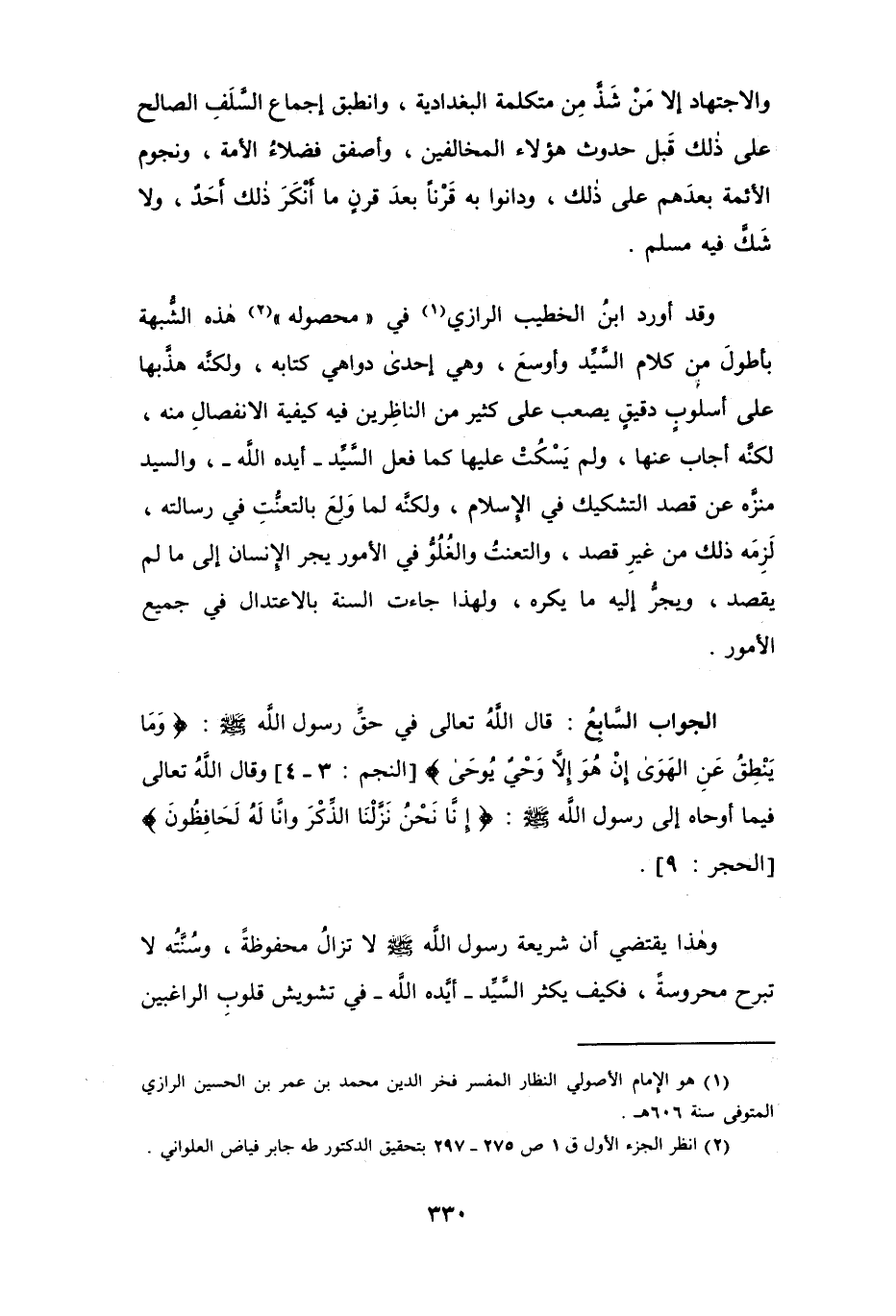 وقد أورد ابن الخطيب الرازي (¬1) في " محصوله " (¬2) هذه الشُّبهة بأطول من كلام السَّيِّد وأوسعَ، وهي إحدى دواهي كتابه، ولكنَّه هذَّبها على أسلوبٍ دقيقٍ يصعب على كثير من الناظِرين فيه كيفية الانفصالِ منه، لكنَّه أجاب عنها، ولم يسْكُتْ عليها كما فعل السَّيِّد -أيده الله-، والسيد منزَّه عن قصد التشكيك في الإسلام، ولكنه لما وَلِعَ بالتعنُّتِ في رسالته، لَزِمَه ذلك من غيرِ قصد، والتعنتُ والغُلُوُّ في الأمور يجر الإنسان إلى ما لم يقصد، ويجرُّ إليه ما يكره، ولهذا جاءت السنة بالاعتدال في جميع الأمور.