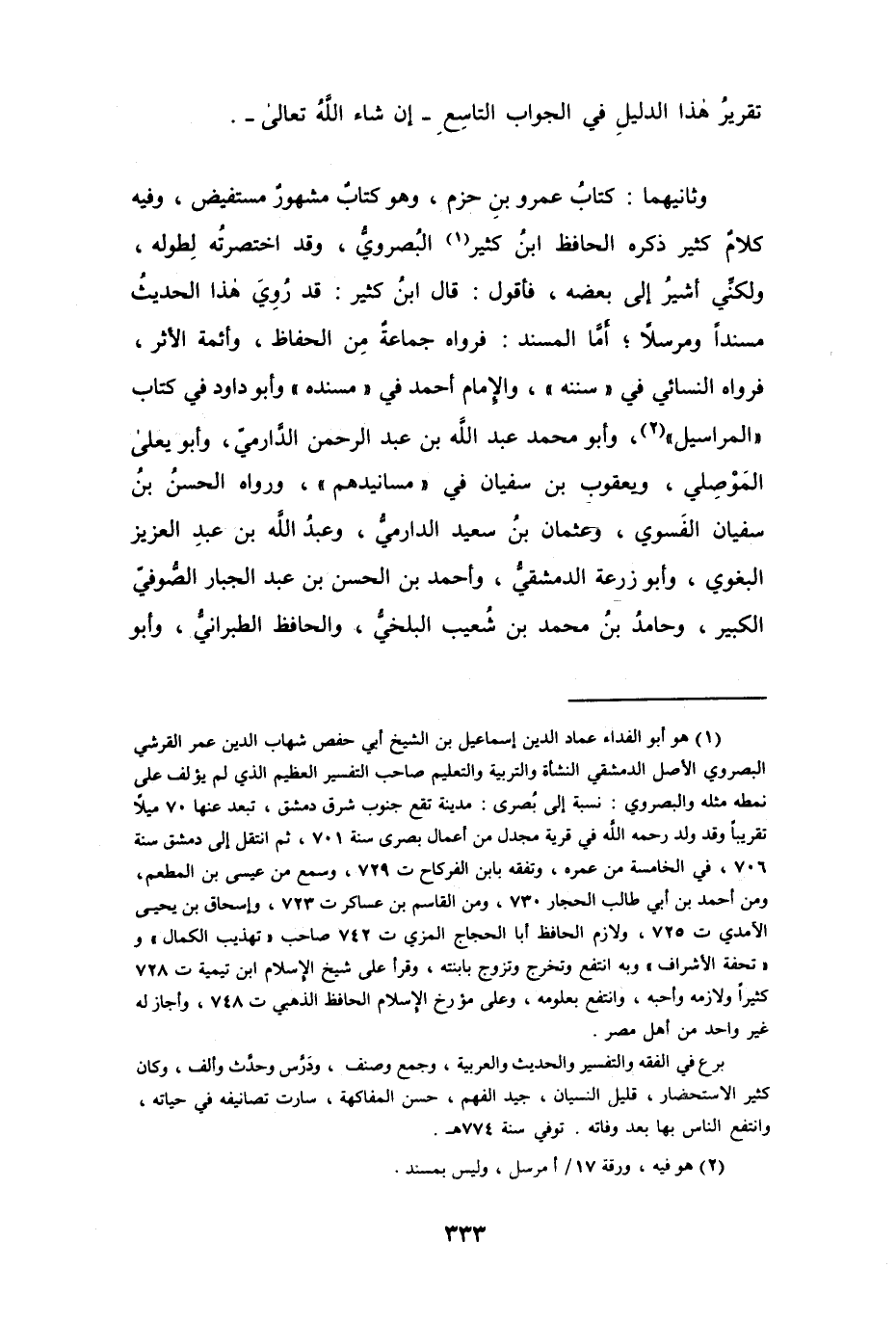 (¬1) هو أبو الفداء عماد الدين إسماعيل بن الشيخ أبي حفص شهاب الدين عمر القرشي البصروي الأصل الدمشقي النشأة والتربية والتعليم صاحب التفسير العظيم الذي لم يؤلف على نمطه مثله والبصروي: نسبة إلى بُصرى: مدينة تقع جنوب شرق دمشق، تبعد عنها 70 ميلاً تقريباً وقد ولد رحمه الله في قرية مجدل من أعمال بصرى سنة 701، ثم انتقل إلى دمشق سنة 706، في الخامسة من عمره، وتفقه بابن الفركاح ت 729، وسمع من عيسى بن المطعم، ومن أحمد بن أبي طالب الحجار 730، ومن القاسم بن عساكر ت 723، وإسحاق بن يحيى الآمدي ت 725، ولازم الحافظ أبا الحجاج المزي ت 742 صاحب " تهذيب الكمال " و " تحفة الأشراف " وبه انتفع وتخرج وتزوج بابته، وقرأ على شيخ الإسلام ابن تيمية ت 728 كثيراً ولازمه وأحبه، وانتفع بعلومه، وعلى مؤرخ الإسلام الحافظ الذهبي ت 748، وأجاز له غير واحد من أهل مصر.