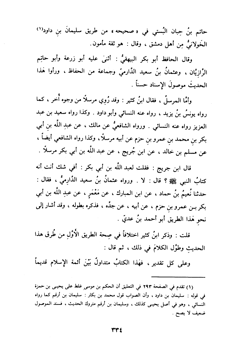 قال ابن جريج: فقلت لعبد الله بن أبي بكر: أفي شك أنت أنه كتابُ النبي - صلى الله عليه وسلم -؟ قال: لا. ورواه عثمانُ بنُ سعيد الدَّارِميُّ، فقال: حدثنا نُعيمُ بنُ حماد، عن ابن المبارك، عن مَعْمَرٍ، عن عبدِ الله بن أبي بكر بن عمرو بنِ حزم، عن أبيه، عن جدِّه، فذكره بطوله، وقد أشار إلى نحوِ هذا الطريق أبو أحمد بنُ عديّ.