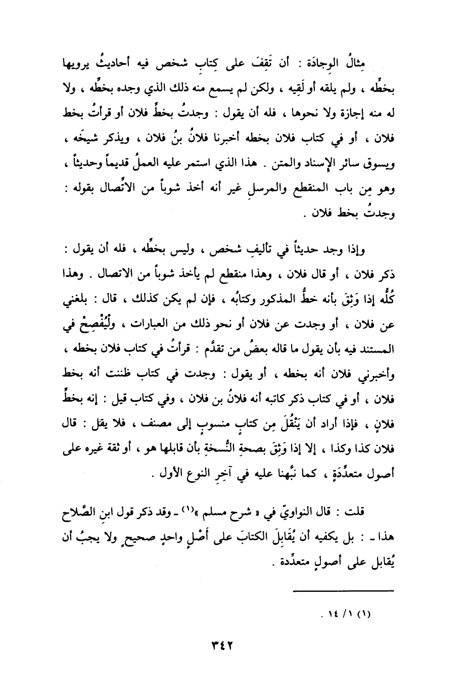 وإذا وجد حديثاًً في تأليفِ شخص، وليس بخطِّه، فله أن يقول: ذكر فلان، أو قال فلان، وهذا منقطع لم يأخذ شوباً من الاتصال. وهذا كُلُّه إذا وَثِق بأنه خطُّ المذكور وكتابُه، فإن لم يكن كذلك، قال: بلغني عن فلان، أو وجدت عن فلان أو نحو ذلك من العبارات، ولْيُفْصِحْ في المستند فيه بأن يقول ما قاله بعضُ من تقدَّم: قرأتُ في كتاب فلان بخطه، وأخبرني فلان أنه بخطه، أو يقول: وجدت في كتاب ظننت أنه بخط فلان، أو في كتاب ذكر كاتبه أنه فلانُ بن فلان، وفي كتاب قيل: إنه بخطِّ فلانٍ، فإذا أراد أن يَنْقُلَ مِن كتابٍ منسوبٍ إلى مصنف، فلا يقل: قال فلان كذا وكذا، إلا إذا وَثِقَ بصحةِ النُّسخةِ بأن قابلها هو، أو ثقة غيره على أصول متعدِّدَةٍ، كما نبَّهنا عليه في آخِرِ النوع الأول.