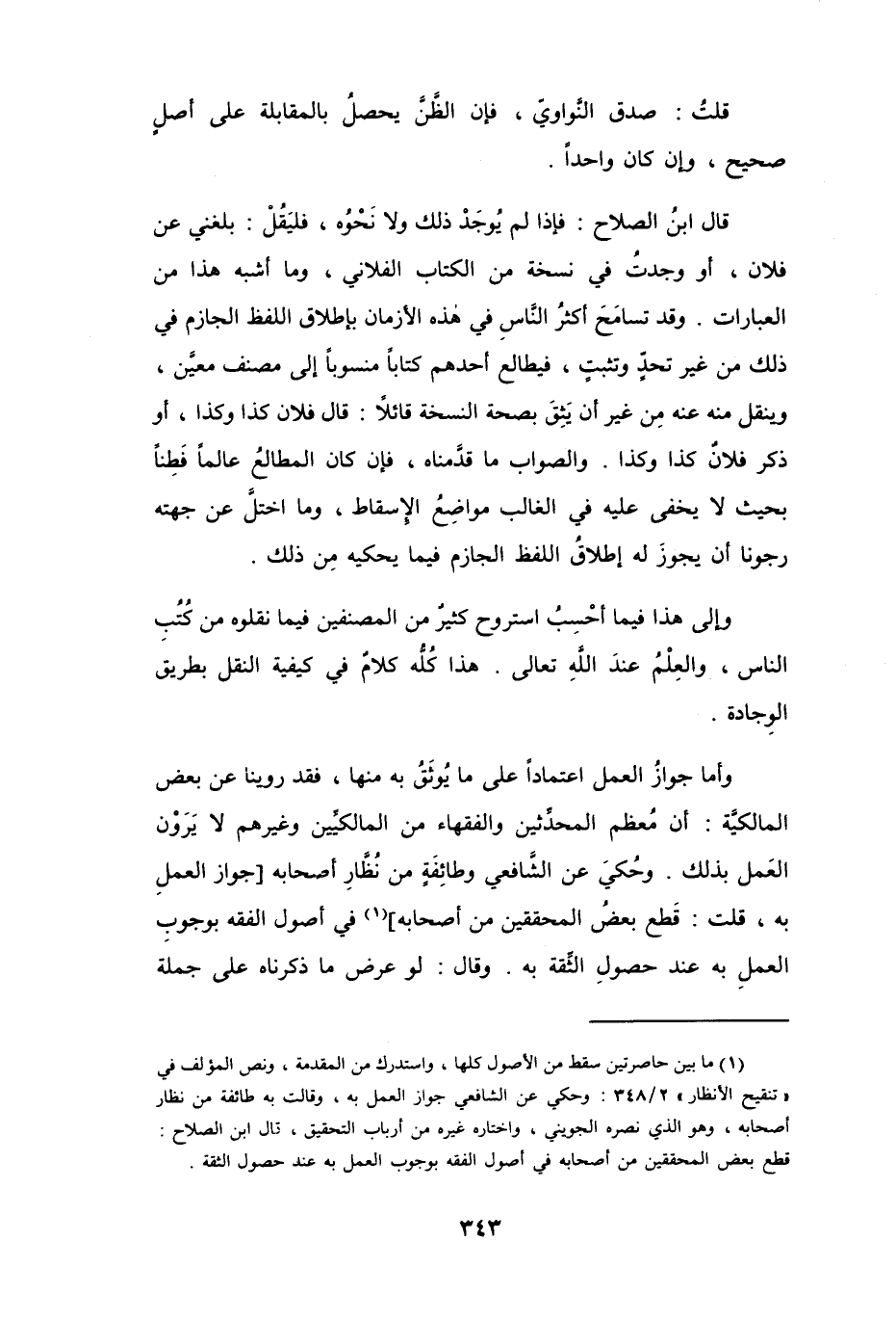 (¬1) ما بين حاصرتين سقط من الأصول كلها، واستدرك من المقدمة، ونص المؤلف في " تنقيح الأنظار " 2/ 348: وحكي عن الشافعي جواز العمل به، وقالت به طائفة من نظار أصحابه، وهو الذي نصره الجويني، واختاره غيره من أرباب التحقيق، قال ابن الصلاح: قطع بعض المحققين من أصحابه في أصول الفقه بوجوب العمل به عند حصول الثقة.