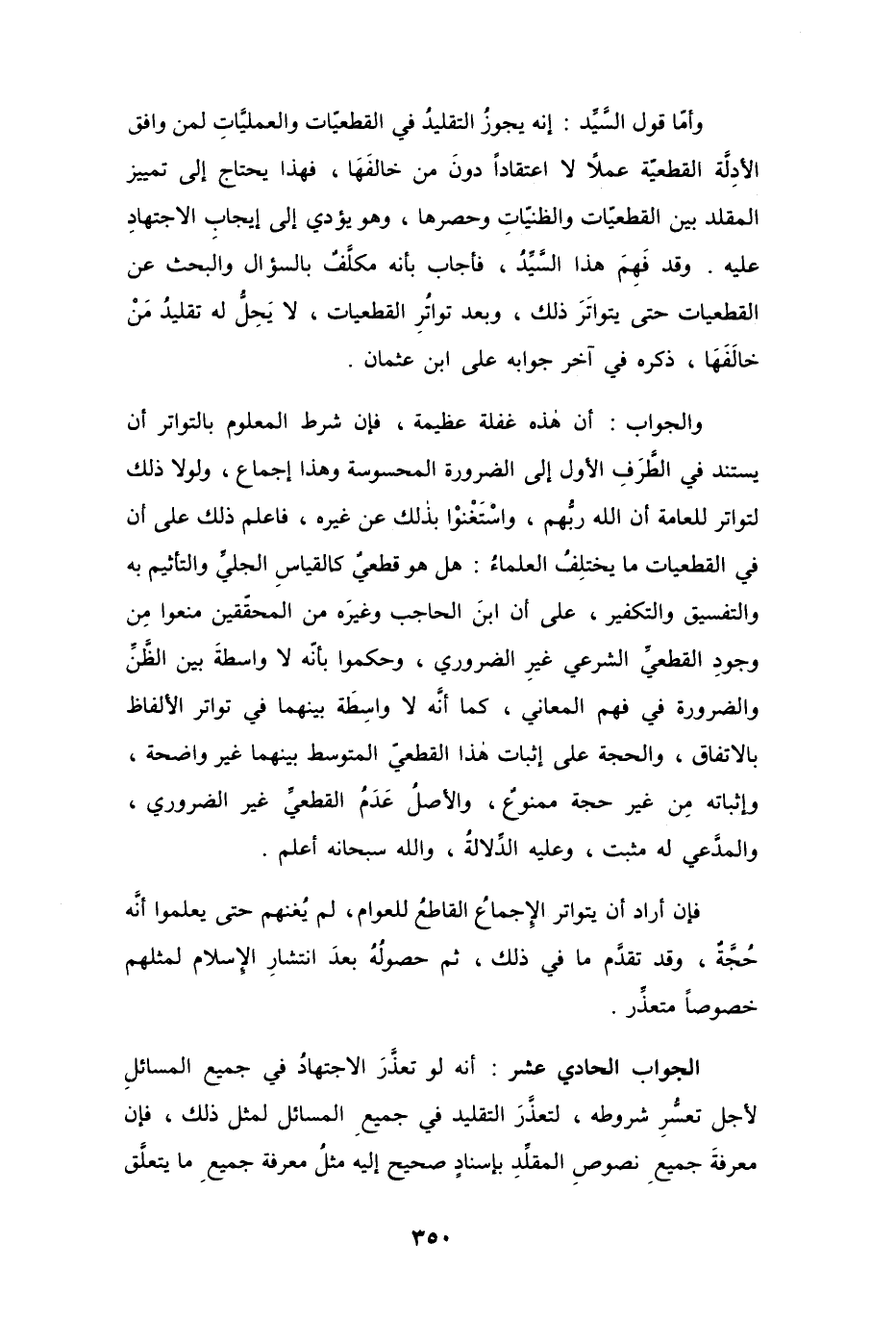 الجواب الحادي عشر: أنه لو تعذَّرَ الاجتهادُ في جميع المسائلِ لأجل تعسُّرِ شروطه، لتعذَّرَ التقليد في جميعِ المسائل لمثل ذلك، فإن معرفةَ جميعِ نصوصِ المقلِّدِ بإسنادٍ صحيح إليه مثلُ معرفة جميعِ ما يتعلَّق