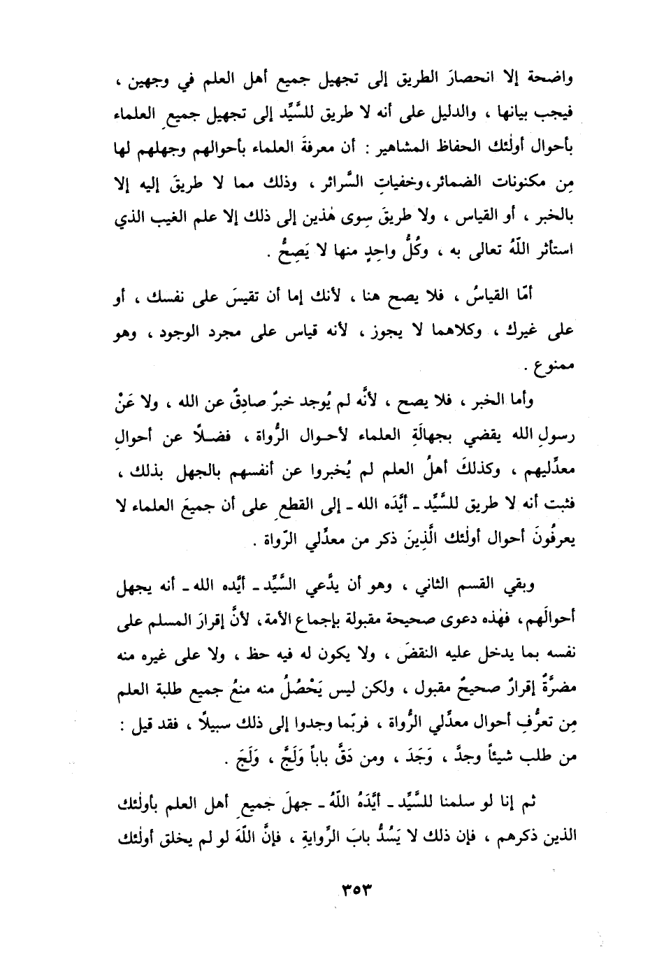 وأما الخبر، فلا يصح، لأنَّه لم يُوجد خبرٌ صادِقٌ عن الله، ولا عَنْ رسولِ الله يقضي بجهالَةِ العلماء لأحوال الرُّواة، فضلاً عن أحوالِ معدِّليهم، وكذلكَ أهلُ العلم لم يُخبروا عن أنفسهم بالجهل بذلك، فثبت أنه لا طريق للسَّيِّد -أيَّدَه الله- إلى القطعِ على أن جميعَ العلماء لا يعرفُونَ أحوال أولئك الَّذِينَ ذكر من معدِّلي الرّواة.