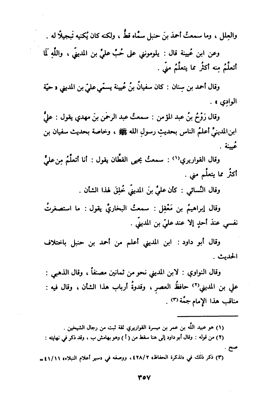 وقال النواوي: لابن المديني نحو من ثمانين مصنفاً، وقال الذهبي: علي بن المديني (¬2) حافظُ العصرِ، وقدوةُ أرباب هذا الشأن، وقال فيه: مناقب هذا الإمام جمَّة (¬3).