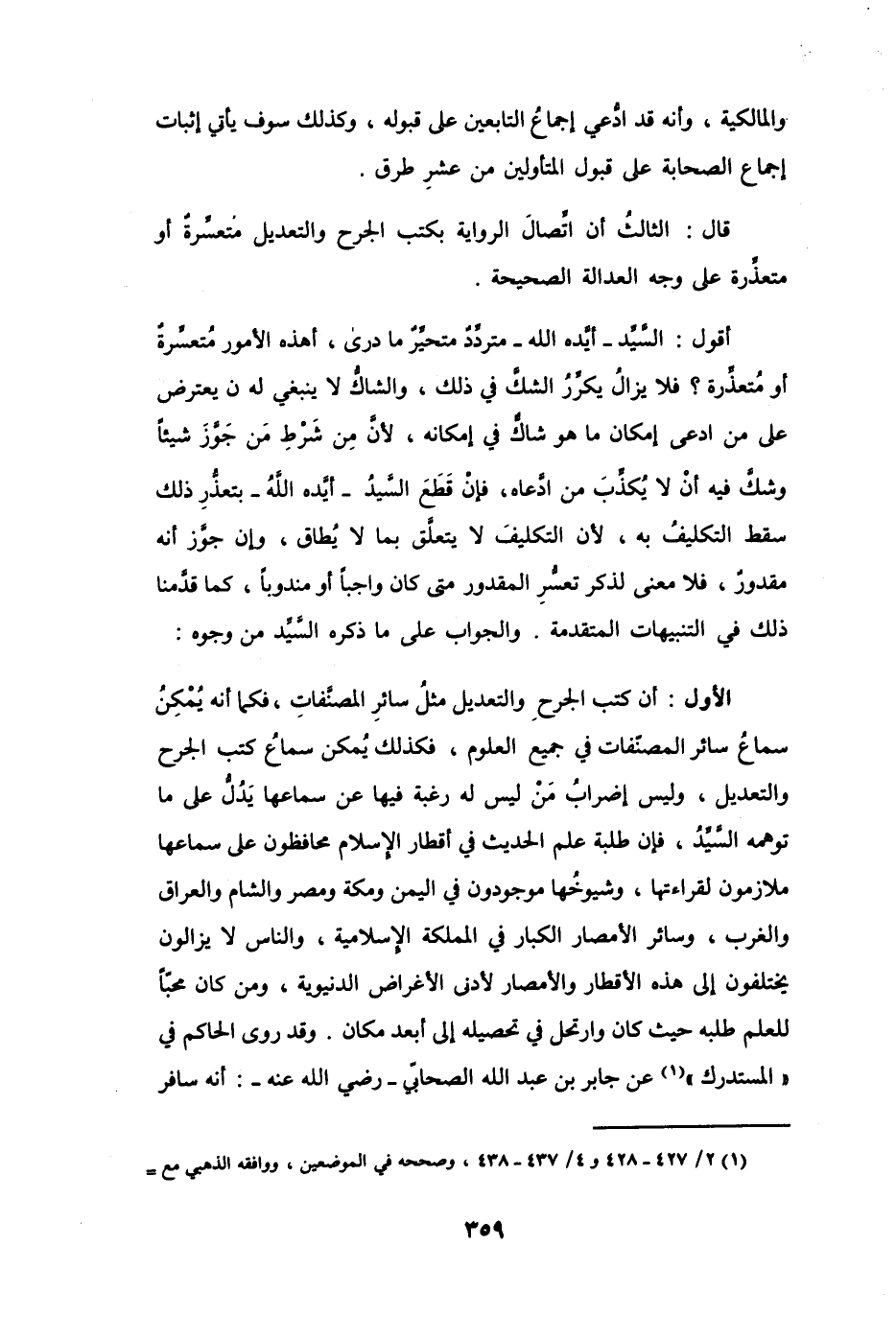 الأول: أن كتب الجرحِ والتعديل مثلُ سائرِ المصنَّفات، فكما إنه يُمْكِنُ سماعُ سائر المصنفات في جميع العلوم، فكذلك يُمكن سماعُ كتب الجرح والتعديل، وليس إضرابُ منْ ليس له رغبة فيها عن سماعها يَدُلُّ على ما توهمه السَّيِّدُ، فإن طلبة علم الحديث في أقطار الإسلام محافظون على سماعها ملازمون لقراءتها، وشيوخُها موجودون في اليمن ومكة ومصر والشام والعراق والغرب، وسائر الأمصار الكبار في المملكة الإسلامية، والناس لا يزالون يخنلفون إلى هذه الأقطار والأمصار لأدنى الأغراض الدنيوية، ومن كان محبّاً للعلم طلبه حيث كان وارتحل في تحصيله إلى أبعد مكان. وقد روى الحاكم في " المستدرك " (¬1) عن جابر بن عبد الله الصحابي -رضي الله عنه-: أنه سافر