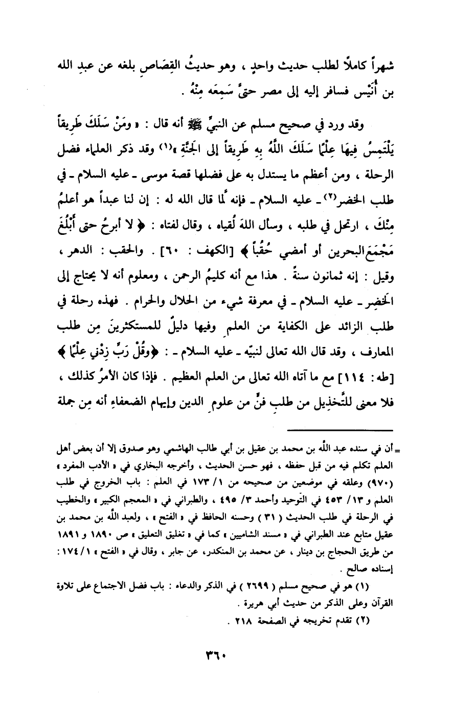 وقد ورد في صحيح مسلم عن النبيِّ - صلى الله عليه وسلم - أنه قال: " ومَنْ سَلكَ طَرِيقاً يَلْتَمِسُ فِيهَا عِلْماً سَلَكَ اللهُ بِهِ طَرِيقاً إلى الجنَّة " (¬1) وقد ذكر العلماء فضل الرحلة، ومن أعظم ما يستدل به على فضلها قصة موسى -عليه السلام- في طلب الخضر (¬2) -عليه السلام- فإنه لما قال الله له: إن لنا عبداً هو أعلمُ مِنْكَ، ارتحل في طلبه، وسأل اللهَ لُقياه، وقال لفتاه: {لَا أَبْرَحُ حَتَّى أَبْلُغَ مَجْمَعَ الْبَحْرَيْنِ أَوْ أَمْضِيَ حُقُبًا} [الكهف: 60]. والحقب: الدهر، وقيل: إنه ثمانون سنةً. هذا مع أنه كليمُ الرحمن، ومعلوم أنه لا يحتاج إلى الَخضِر -عليه السلام- في معرفة شيء من الحلال والحرام. فهذه رحلة في طلب الزائد على الكفاية من العلمِ وفيها دليلٌ للمستكثرينَ مِن طلب المعارف، وقد قال الله تعالى لنبيِّه -عليه السلام-: {وَقُلْ رَبِّ زِدْنِي عِلْمًا} [طه: 114] مع ما آتاه الله تعالى من العلم العظيم. فإذا كان الأمرُ كذلك، فلا معنى للتَّخذيل من طلبِ فنٍّ من علومِ الدين وإيهام الضعفاءِ أنه مِن جملة