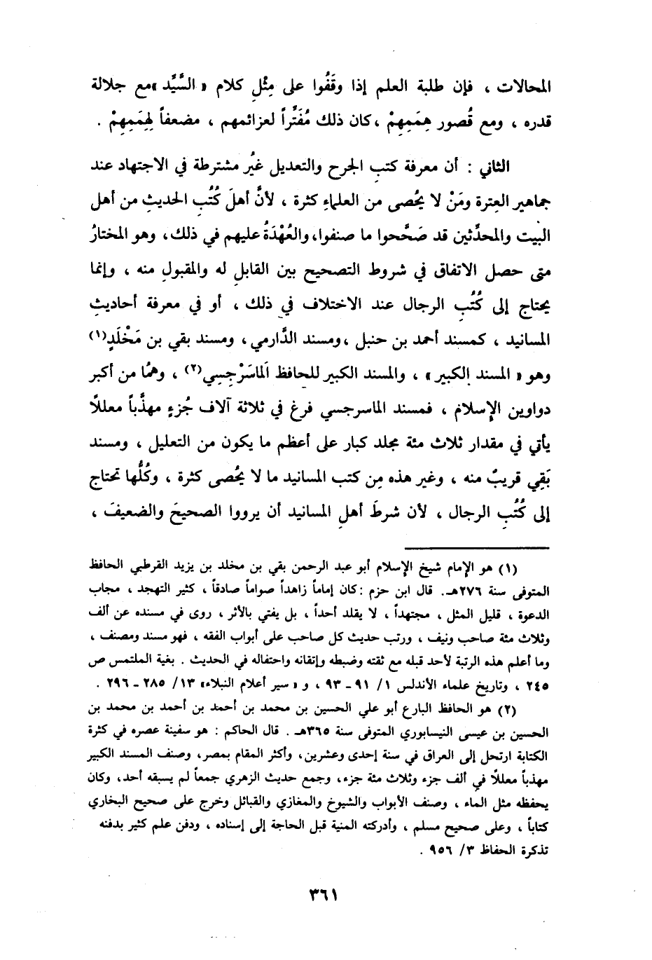 الثاني: أن معرفة كتبِ الجرح والتعديل غيُر مشترطة في الاجتهاد عند جماهير العِترة ومنْ لا يحُصى من العلماءِ كثرة، لأنَّ أهلَ كُتُبِ الحديثِ من أهل البيت والمحدِّثين قد صَحَّحوا ما صنفوا، والعُهْدَةُ عليهم في ذلك، وهو المختارُ متى حصل الاتفاق في شروط التصحيح بين القابلِ له والمقبولِ منه، وإنما يحتاج إلى كُتُبِ الرجال عند الاختلاف في ذلك، أو في معرفة أحاديثِ المسانيد، كمسَند أحمد بن حنبل، ومسند الدَّارمي، ومسند بقي بن مَخْلَدٍ (¬1) وهو " المسند الكبير "، والمسند الكبير للحافظ الماسَرْجِسِي (¬2)، وهمُا من أكبر دواوين الإسلام، فمسند الماسرجسي فرغ في ثلاثة آلاف جُزءٍ مهذَّباً معللاً يأتي في مقدار ثلاث مئة مجلد كبار على أعظم ما يكون من التعليل، ومسند بَقِي قريبٌ منه، وغير هذه من كتب المسانيد ما لا يُحصى كثرة، وكُلُّها تحتاج إلى كُتُبِ الرجال، لأن شرط أهلِ المسانيد أن يرووا الصحيحَ والضعيف،