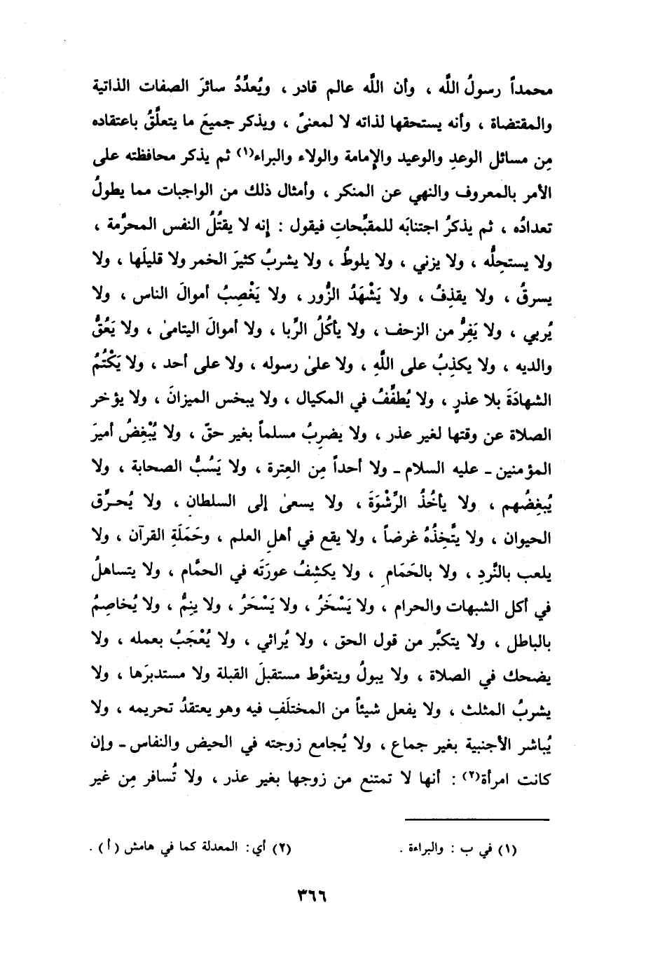 محمداً رسولُ الله، وأن الله عالم قادر، ويُعدِّدُ سائر الصفات الذاتية والمقتضاة، وأنه يستحقها لذانه لا لمعنىً، ويذكر جميعَ ما يتعلَّقُ باعتقاده مِن مسائل الوعدِ والوعيد والإمامة والولاء والبراء (¬1) ثم يذكر محافظته على الأمر بالمعروف والنهي عن المنكر، وأمثال ذلك من الواجبات مما يطولُ تعدادُه، ثم يذكرُ اجتنابَه للمقبِّحاتِ فيقول: إنه لا يقتُلُ النفس المحرَّمة، ولا يستحِلُّه، ولا يزني، ولا يلوطُ، ولا يشربُ كثيرَ الخمر ولا قليلَها، ولا يسرقُ، ولا يقذِفُ، ولا يَشْهَدُ الزُّور، ولا يَغْصِبُ أموالَ الناس، ولا يُربي، ولا يَفِرُّ من الزحف، ولا يأكُلُ الرِّبا، ولا أموالَ اليتامى، ولا يعُقُّ والديه، ولا يكذِبُ على اللهِ، ولا على رسوله، ولا على أحد، ولا يَكتُمُ الشهادَةَ بلا عذرٍ، ولا يُطفِّفُ في المكيال، ولا يبخس الميزانَ، ولا يؤخر الصلاة عن وقتها لغير عذر، ولا يضرِبُ مسلماً بغير حق، ولا يُبْغِضُ أميرَ المؤمنين -عليه السلام- ولا أحداً مِن العِترة، ولا يَسُبُّ الصحابة، ولا يُبغِضُهم، ولا يأخُذُ الرشْوةَ، ولا يسعى إلى السلطان، ولا يُحرِّق الحيوان، ولا يتَّخِذُهُ غرضاً، ولا يقع في أهلِ العلم، وحَمَلَةِ القرآن، ولا يلعب بالنَّردِ، ولا بالحَمَام، ولا يكشِفُ عورَتَه في الحمَّام، ولا يتساهلُ في أكل الشبهات والحرام، ولا يَسْخَرُ، ولا يسْحَرُ، ولا ينِمُّ، ولا يُخاصِمُ بالباطل، ولا يتكبَّر من قول الحق، ولا يُرائي، ولا يُعْجَبُ بعمله، ولا يضحك في الصلاة، ولا يبولُ ويتغوَّط مستقبلَ القبلة ولا مستدبرَها، ولا يشربُ المثلث، ولا يفعل شيئاً من المختلَفِ فيه وهو يعتقدُ تحريمه، ولا يُباشر الأجنبية بغير جماع، ولا يُجامع زوجته في الحيض والنفاس -وإن كانت امرأة (¬2): أنها لا تمتنع من زوجها بغير عذر، ولا تُسافر مِن غير