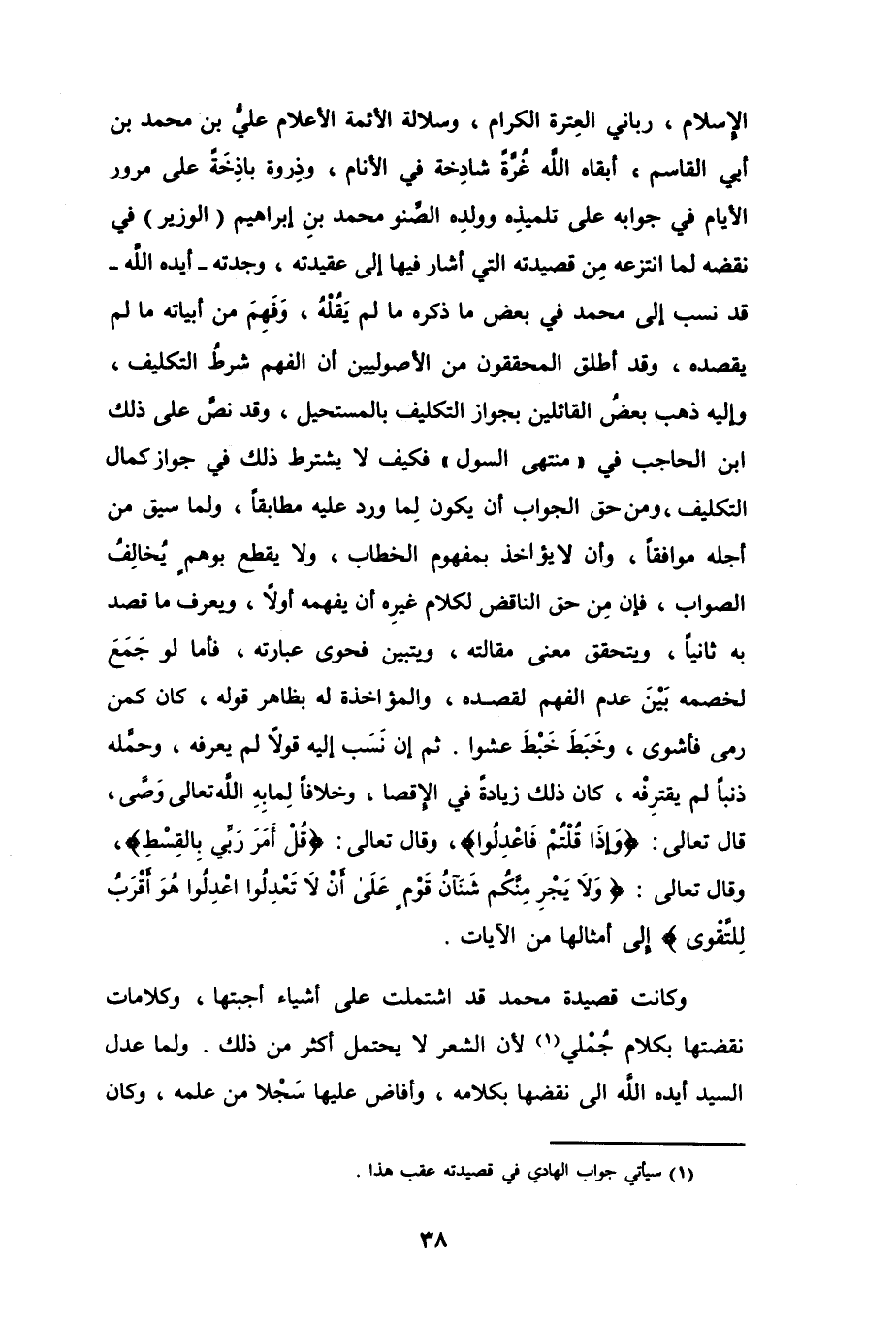 الإسلام، رباني العِترة الكرام، وسلالة الأئمة الأعلام عليُّ بن محمد بن أبي القاسم، أبقاه الله غُرَّةً شادِخة في الأنام، وذِروة باذِخَةً على مرور الأيام في جوابه على تلميذه وولدِه الصَّنو محمد بنِ إبراهيم (الوزير) في نقضه لما انتزعه مِن قصيدته التي أشار فيها إلى عقيدته، وجدته -أيده الله- قد نسب إلى محمد في بعض ما ذكره ما لم يَقُلْه، وَفَهِمَ من أبياته ما لم يقصده، وقد أطلق المحققون من الأصوليين أن الفهم شرطُ التكليف، وإليه ذهب بعضُ القائلين بجواز التكليف بالمستحيل، وقد نصَّ على ذلك ابن الحاجب في " منتهى السول " فكيف لا يشترط ذلك في جواز كمال التكليف، ومن حق الجواب أن يكون لِما ورد عليه مطابقاً، ولما سيق من أجله موافقاً، وأن لا يؤاخذ بمفهوم الخطاب، ولا يقطع بوهمٍ يُخالِفُ الصواب، فإن مِن حق الناقض لكلام غيرِه أن يفهمه أولاً، ويعرف ما قصد به ثانياً، ويتحقق معنى مقالته، ويتبين فحوى عبارته، فأما لو جمَعَ لخصمه بَيْنَ عدم الفهم لقصده، والمؤاخذة له بظاهر قوله، كان كمن رمى فأشوى، وخَبَطَ خَبْطَ عشوا. ثم إن نَسَب إليه قولاً لم يعرفه، وحمَّله ذنباً لم يقترِفْه، كان ذلك زيادةً في الإقصا، وخلافاً لِما بِهِ الله تعالى وَصَّى، قال تعالى: {وَإذَا قُلْتُمْ فاعْدِلُوا}، وقال تعالى: {قُلْ أمَرَ ربِّي بالقِسْطِ}، وقال تعالى: {وَلاَ يَجْرِمِنكُم شَنَآنُ قَوْمٍ عَلى أنْ لاَ تَعْدِلُوا اعْدِلُوا هُوَ أقْرَبُ لِلتَّقوى} إلى أمثالها من الآيات.