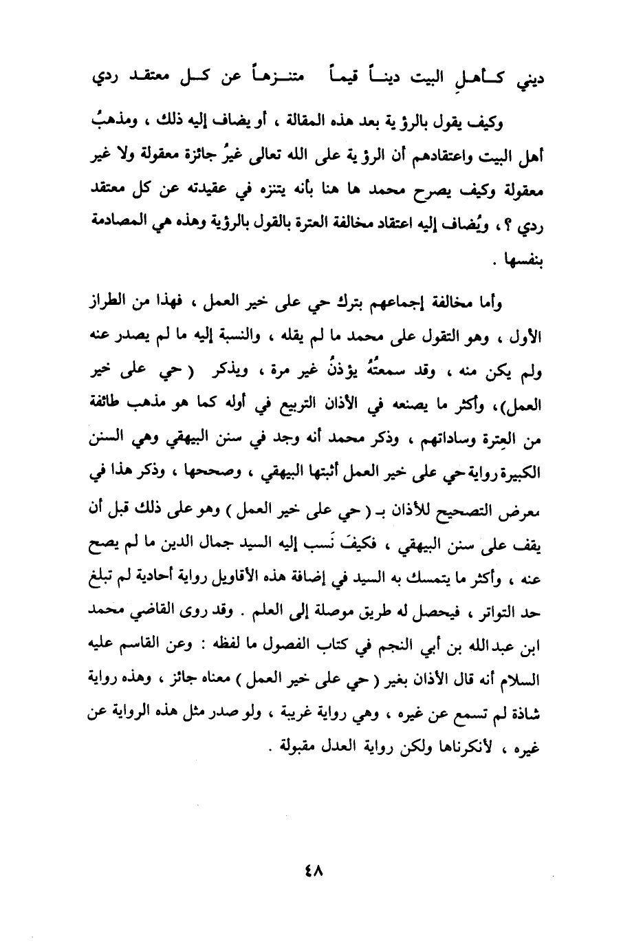 وأما مخالفة إجماعهم بترك حي على خير العمل، فهذا من الطراز الأول، وهو التقول على محمد ما لم يقله، والنسبة إليه ما لم يصدر عنه ولم يكن منه، وقد سمعتُهُ يؤذنُ غير مرة، ويذكر (حي على خير العمل)، وأكثر ما يصنعه في الأذان التربيع في أوله كما هو مذهب طائفة من العترة وساداتهم، وذكر محمد أنه وجد في سنن البيهقي وهي السنن الكبيرة رواية حي على خير العمل أثبتها البيهقي، وصححها، وذكر هذا في معرض التصحيح للأذان بـ (حي على خير العمل) وهو على ذلك قبل أن يقف على سنن البيهقي، فكيفَ نَسب إليه السيد جمال الدين ما لم يصح عنه، وأكثر ما يتمسك به السيد في إضافة هذه الأقاويل رواية أحادية لم تبلغ حد التواتر، فيحصل له طريق موصلة إلى العلم. وقد روى القاضي محمد ابن عبد الله بن أبي النجم في كتاب الفصول ما لفظه: وعن القاسم عليه السلام أنه قال الأذان بغير (حي على خير العمل) معناه جائز، وهذه رواية شاذة لم تسمع عن غيره، وهي رواية غريبة، ولو صدر مثل هذه الرواية عن غيره، لأنكرناها ولكن رواية العدل مقبولة.