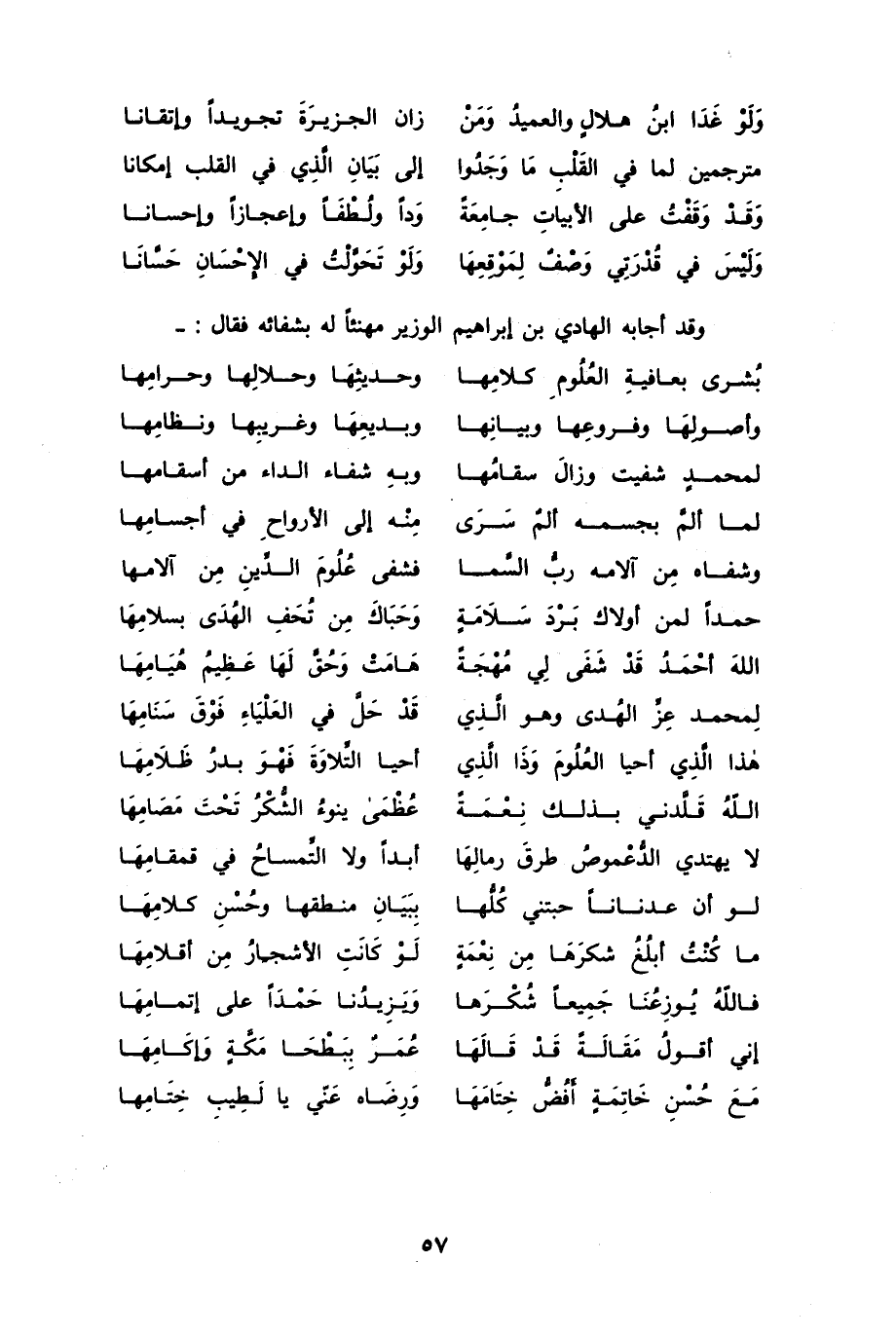 وقد أجابه الهادي بن إبراهيم الوزير مهنئاً له بشفائه فقال: -