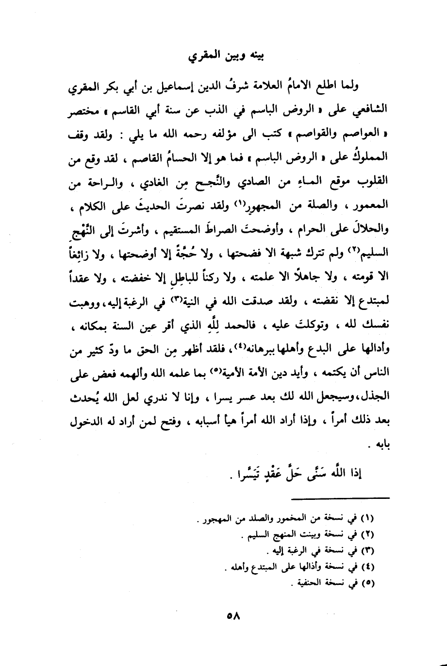 ولما اطلع الإمامُ العلامة شرفُ الدين إسماعيل بن أبي بكر المقري الشافعي على " الروض الباسم في الذب عن سنة أبي القاسم " مختصر " العواصم والقواصم " كتب إلى مؤلفه رحمه الله ما يلي: ولقد وقف المملوكُ على " الروض الباسم " فما هو إلا الحسامُ القاصم، لقد وقع من القلوب موقع الماءِ من الصادي والنَّجح من الغادي، والراحة من المعمور، والصلة من المجهور (¬1) ولقد نصرتَ الحديثَ على الكلام، والحلالَ على الحرام، وأوضحت الصراطَ المستقيم، وأشرت إلى النَّهْجِ السليم (¬2)، ولم تترك شبهة إلا فضحتها، ولا حُجَّةً إلا أوضحتها، ولا زائِغاً إلا قومته، ولا جاهلاً إلا علمته، ولا ركناً للباطِل إلا خفضته، ولا عقداً لمبتدع إلا نقضته، ولقد صدقت الله في النية (¬3) في الرغبة إليه، ووهبت نفسك لله، وتوكلتَ عليه، فالحمد للهِ الذي أقر عين السنة بمكانه، وأدالها على البدع وأهلها ببرهانه (¬4)، فلقد أظهر مِن الحق ما ودَّ كثير من الناس أن يكتمه، وأيد دين الأمة الأمية (¬5) بما علمه الله وألهمه فعض على الجذل، وسيجعل الله لك بعد عسر يسراً، وإنا لا ندري لعل الله يُحدث بعد ذلك أمراً، وإذا أراد الله أمراً هيأ أسبابه، وفتح لمن أراد له الدخول بابه.