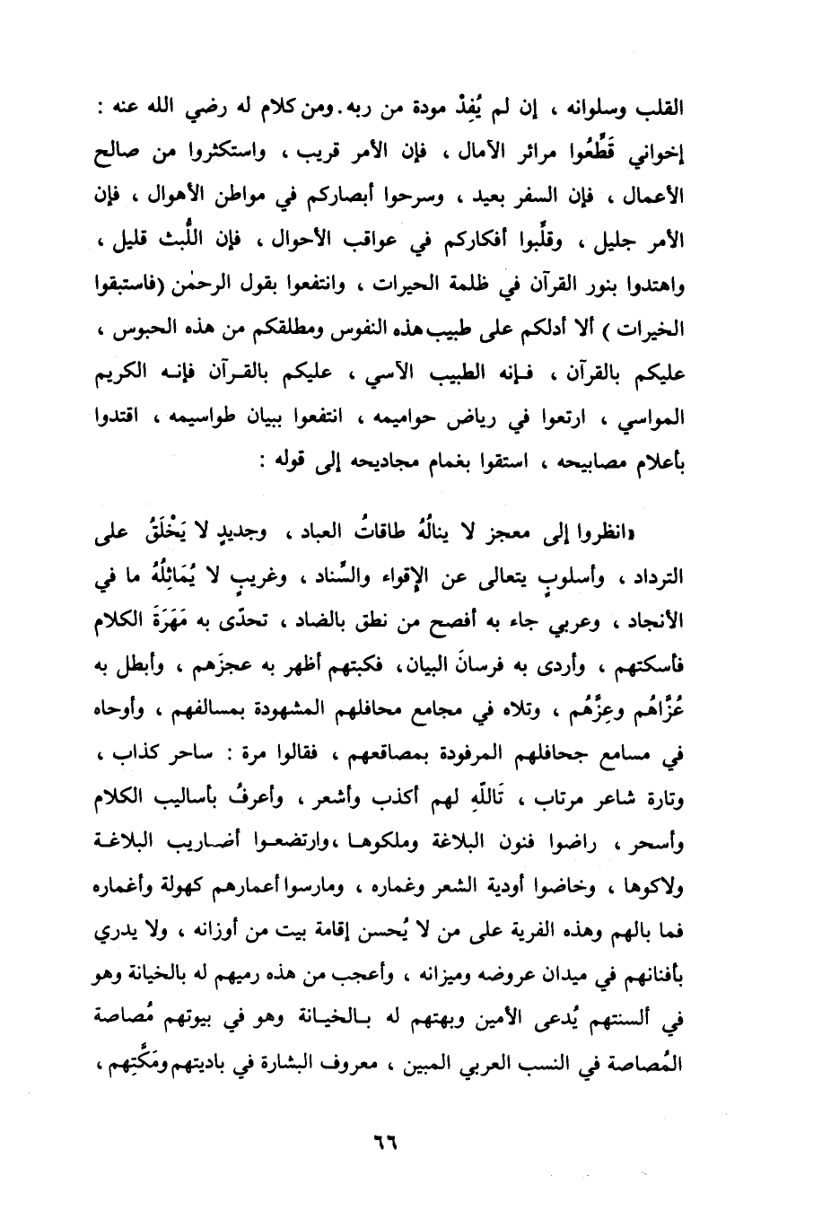 "انظروا إلى معجز لا ينالُهُ طاقاتُ العباد، وجديدٍ لا يَخْلَقُ على الترداد، وأسلوبٍ يتعالى عن الإِقواء والسِّناد، وغريبٍ لا يُمَاثلُهُ ما في الأنجاد، وعربي جاء به أفصح من نطق بالضاد، تحدّى به مَهَرَةَ الكلام فأسكتهم، وأردى به فرسانَ البيان، فكبتهم أظهر به عجزهم، وأبطل به عُزَّاهُم وعِزَّهُم، وتلاه في مجامع محافلهم المشهودة بمسالفهم، وأوحاه في مسامع جحافلهم المرفودة بمصاقعهم، فقالوا مرة: ساحر كذاب، وتارة شاعر مرتاب، تَاللهِ لهم أكذب وأشعر، وأعرفُ بأساليب الكلام وأسحر، راضوا فنون البلاغة وملكوها، وارتضعوا أضاريب البلاغة ولاكوها، وخاضوا أودية الشعر وغماره، ومارسوا أعمارهم كهولة وأغماره فما بالهم وهذه الفرية على من لا يُحسن إقامة بيت من أوزانه، ولا يدري بأفنانهم في ميدان عروضه وميزانه، وأعجب من هذه رميهم له بالخيانة وهو في ألسنتهم يُدعى الأمين وبهتهم له بالخيانة وهو في بيوتهم مُصاصة المُصاصة في النسب العربي المبين، معروف البشارة في باديتهم ومَكَّتِهم،