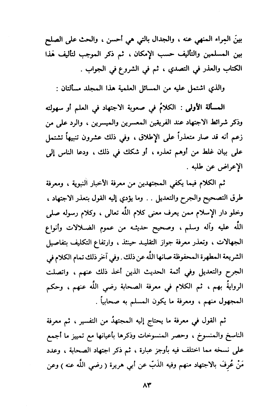 المسألة الأولى: الكلامُ في صعوبة الاجتهاد في العلم أو سهولته وذكر شرائط الاجتهاد عند الفريقين المعسرين والميسرين، والرد على من زعم أنه قد صار متعذراً على الإطلاق، وفي ذلك عشرون تنبيهاً تشتمل على بيان غلط من أوهم تعذره، أو شكك في ذلك، ودعا الناس إلى الإعراض عن طلبه.