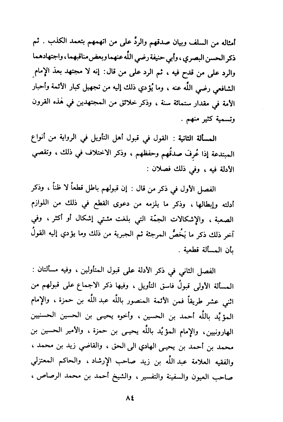 المسألة الأولى قبولُ فاسق التأويل، وفيها ذكر الاجماع على قبولهم من اثني عشر طريقاً فمن الأئمة المنصور بالله عبد الله بن حمزة، والإمام المؤيد بالله أحمد بن الحسين، وأخوه يحيى بن الحسين الحسنيين الهارونيين، والإمام المؤيَّد بالله يحيى بن حمزة، والأمير الحسين بن محمد بن أحمد بن يحيى الهادي إلى الحق، والقاضي زيد بن محمد، والفقيه العلامة عبد الله بن زيد صاحب الإرشاد، والحاكم المعتزلي صاحب العيون والسفينة والتفسير، والشيخ أحمد بن محمد الرصاص،