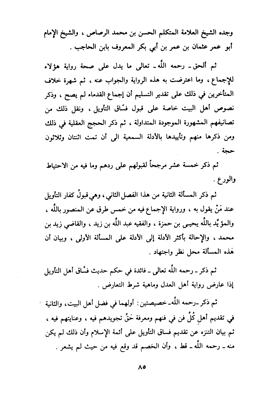 ثم ألحق -رحمه الله- تعالى ما يدل على صحة رواية هؤلاء للإجماع، وما اعترضت به هذه الرواية والجواب عنه، ثم شهرة خلاف المتأخرين في ذلك على تقدير التسليم أن إجماع القدماء لم يصح، وذكر نصوص أهل البيت خاصة على قبول فسّاق التأويل، ونقل ذلك من تصانيفهم المشهورة الموجودة المتداولة، ثم ذكر الحجج العقلية في ذلك ومن ذكرها منهم وتأييدها بالأدلة السمعية إلى أن تمت اثنتان وثلاثون حجة.