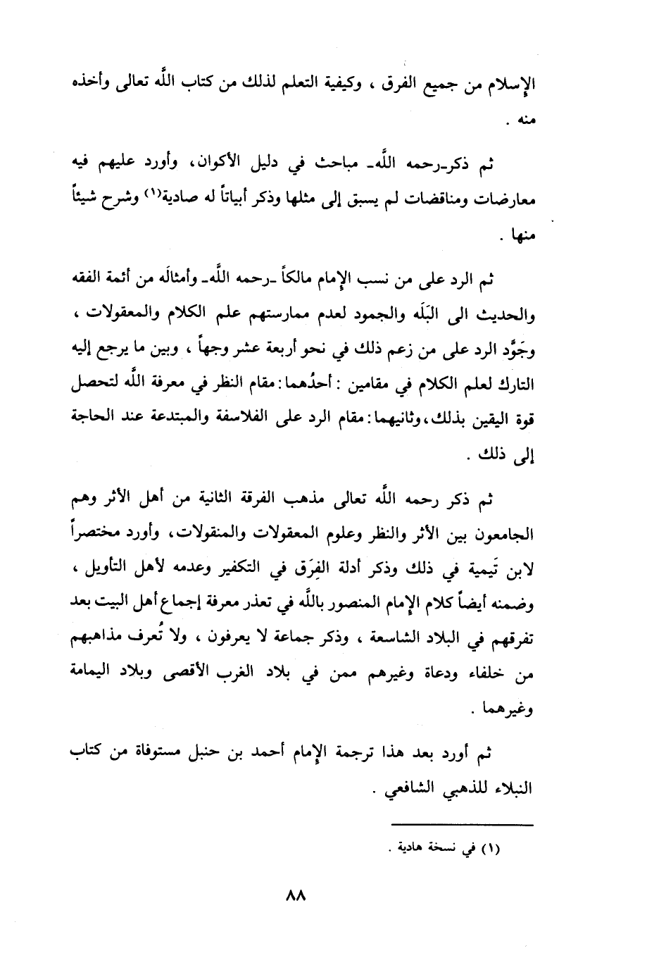 ثم الرد على من نسب الإمام مالكاً -رحمه الله- وأمثالَه من أئمة الفقه والحديث إلى البَلَه والجمود لعدم محارستهم علم الكلام والمعقولات، وجَوَّد الرد على من زعم ذلك في نحو أربعة عشر وجهاً، وبين ما يرجع إليه التارك لعلم الكلام في مقامين: أحدُهما: مقام النظر في معرفة الله لتحصل قوة اليقين بذلك، وثانيهما: مقام الرد على الفلاسفة والمبتدعة عند الحاجة إلى ذلك.
