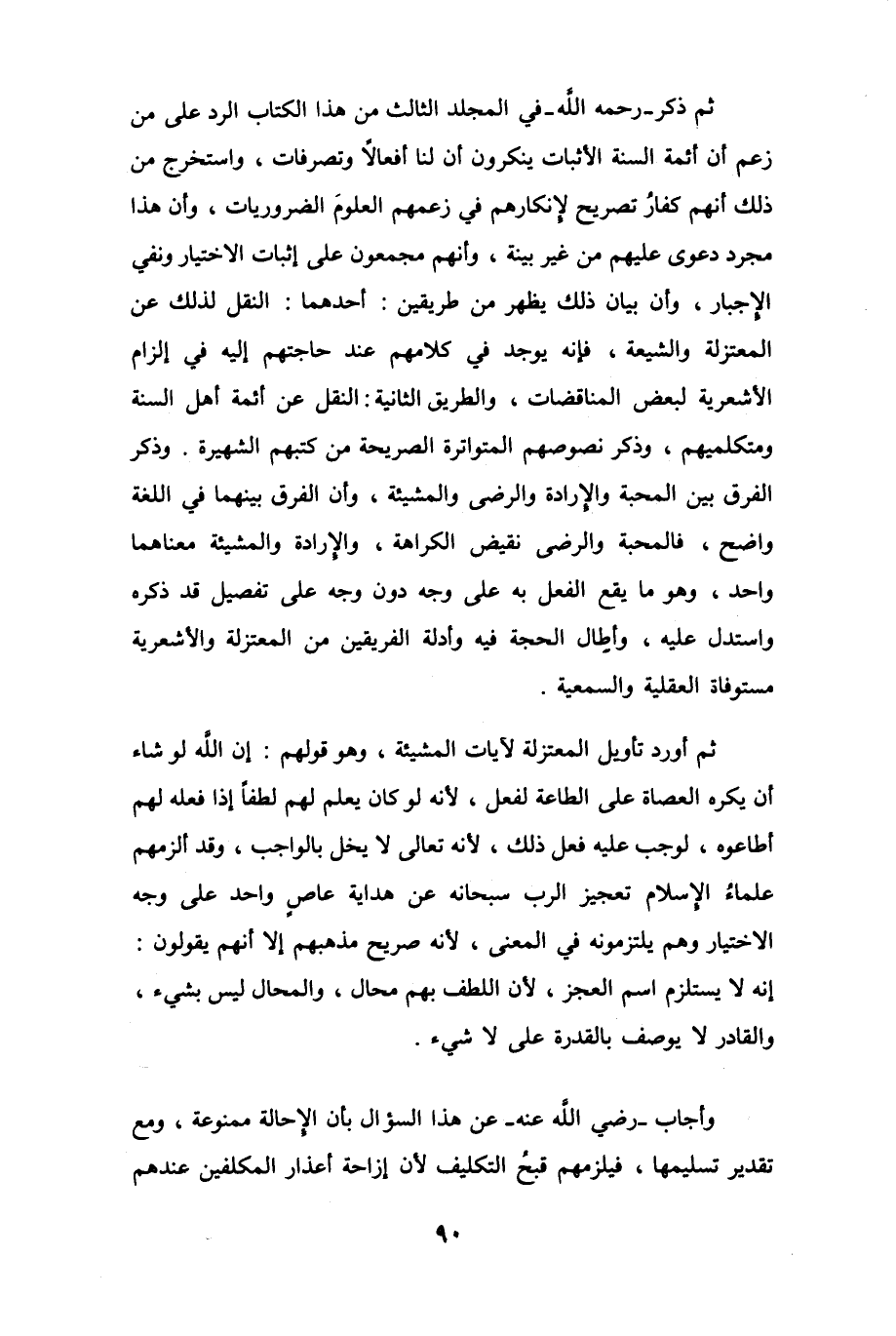 ثم ذكر -رحمه الله- في المجلد الثالث من هذا الكتاب الرد على من زعم أن أئمة السنة الأثبات ينكرون أن لنا أفعالاً وتصرفات، واستخرج من ذلك أنهم كفارُ تصريح لإنكارهم في زعمهم العلومَ الضروريات، وأن هذا مجرد دعوى عليهم من غير بينة، وأنهم مجمعون على إثبات الاختيار ونفي الإجبار، وأن بيان ذلك يظهر من طريقين: أحدهما: النقل لذلك عن المعتزلة والشيعة، فإنه يوجد في كلامهم عند حاجتهم إليه في إلزام الأشعرية لبعض المناقضات، والطريق الثانية: النقل عن أئمة أهل السنة ومتكلميهم، وذكر نصوصهم المتواترة الصريحة من كتبهم الشهيرة. وذكر الفرق بين المحبة والإرادة والرضى والمشيئة، وإن الفرق بينهما في اللغة واضح، فالمحبة والرضى نقيض الكراهة، والإرادة والمشيئة معناهما واحد، وهو ما يقع الفعل به على وجه دون وجه على تفصيل قد ذكره واستدل عليه، وأطِال الحجة فيه وأدلة الفريقين من المعتزلة والأشعرية مستوفاة العقلية والسمعية.