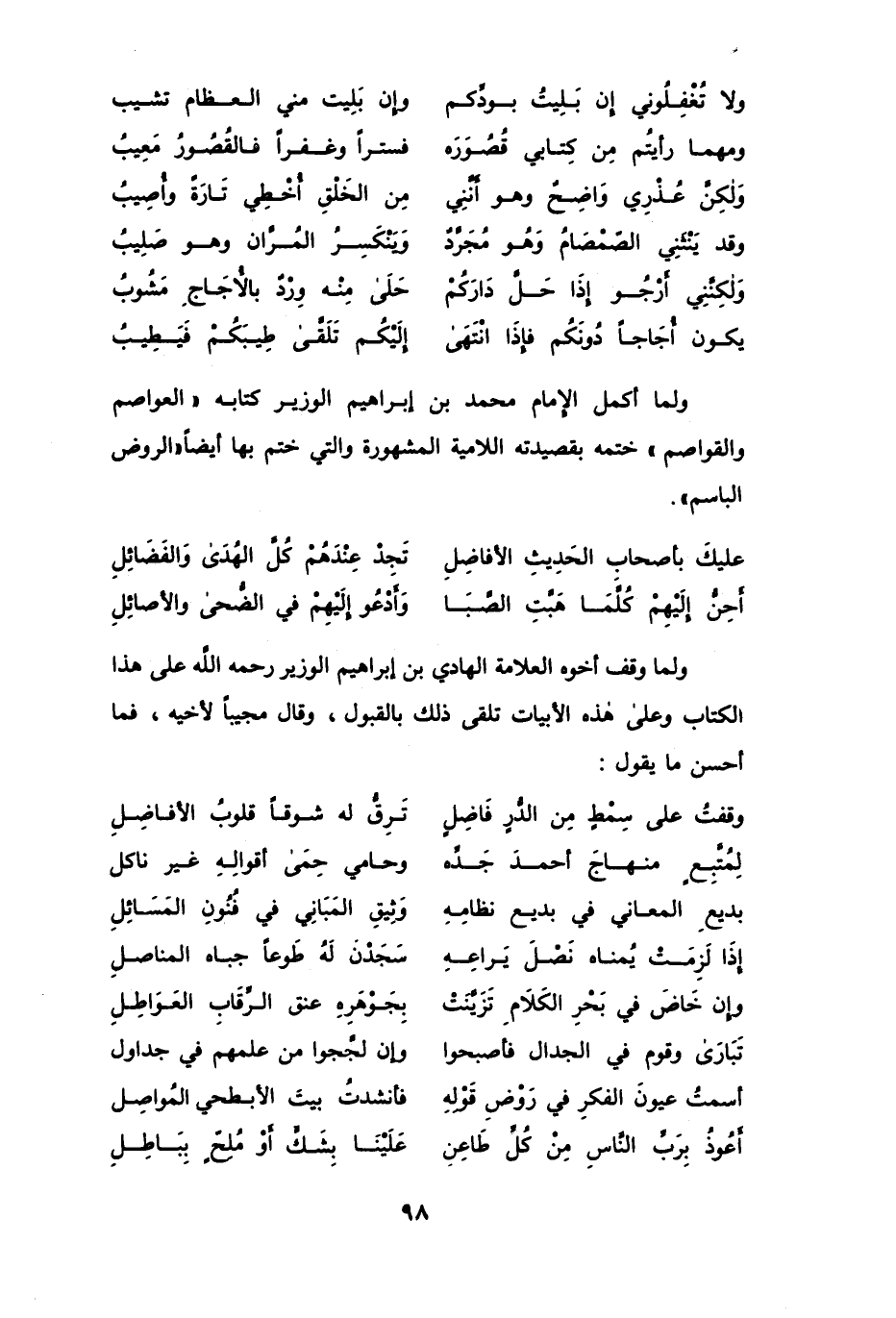 ولما أكمل الإمام محمد بن إبراهيم الوزير كتابه " العواصم والقواصم " ختمه بقصيدته اللامية المشهورة والتي ختم بها أيضاًً " الروض الباسم ".