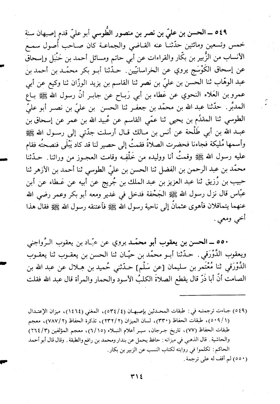 §549 - الْحَسَنُ بْنُ عَلِيِّ بْنِ نَصْرٍ قَدِمَ أَصْبَهَانَ سَنَةَ خَمْسٍ وَتِسْعِينَ وَمِائَتَيْنِ، حَدَّثَنَا عَنْهُ الْقَاضِي وَالْجَمَاعَةُ، كَانَ صَاحِبَ أُصُولٍ، سَمِعَ الْأَنْسَابَ مِنَ الزُّبَيْرِ بْنِ بَكَّارٍ، وَالْقِرَاءَاتِ عَنْ أَبِي حَاتِمٍ، وَمَسَائِلَ أَحْمَدَ بْنِ حَنْبَلٍ وَإِسْحَاقَ عَنْ إِسْحَاقَ الْكَوْسَجِ، يَرْوِي عَنِ الْخُرَاسَانِيِّينَ