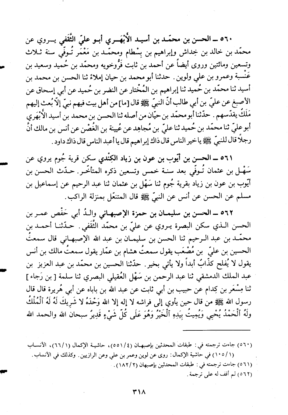 §560 - الْحَسَنُ بْنُ مُحَمَّدِ بْنِ أُسَيْدٍ الْأَبْهَرِيُّ أَبُو عَلِيٍّ الثَّقَفِيُّ يَرْوِي عَنْ مُحَمَّدِ بْنِ خَالِدِ بْنِ خِدَاشٍ، وَإِبْرَاهِيمَ بْنِ بِسْطَامٍ، وَمُحَمَّدِ بْنِ مَعْمَرٍ، تُوُفِّيَ سَنَةَ ثَلَاثٍ وَتِسْعِينَ وَمِائَتَيْنِ، وَرَوَى أَيْضًا عَنْ أَحْمَدَ بْنِ ثَابِتٍ فَرُّوخَوَيْهِ، وَمُحَمَّدِ بْنِ حُمَيْدٍ، وَسَعِيدِ بْنِ عَنْسَبَةَ، وَعَمْرِو بْنِ عَلِيٍّ، وَلُوَيْنٍ