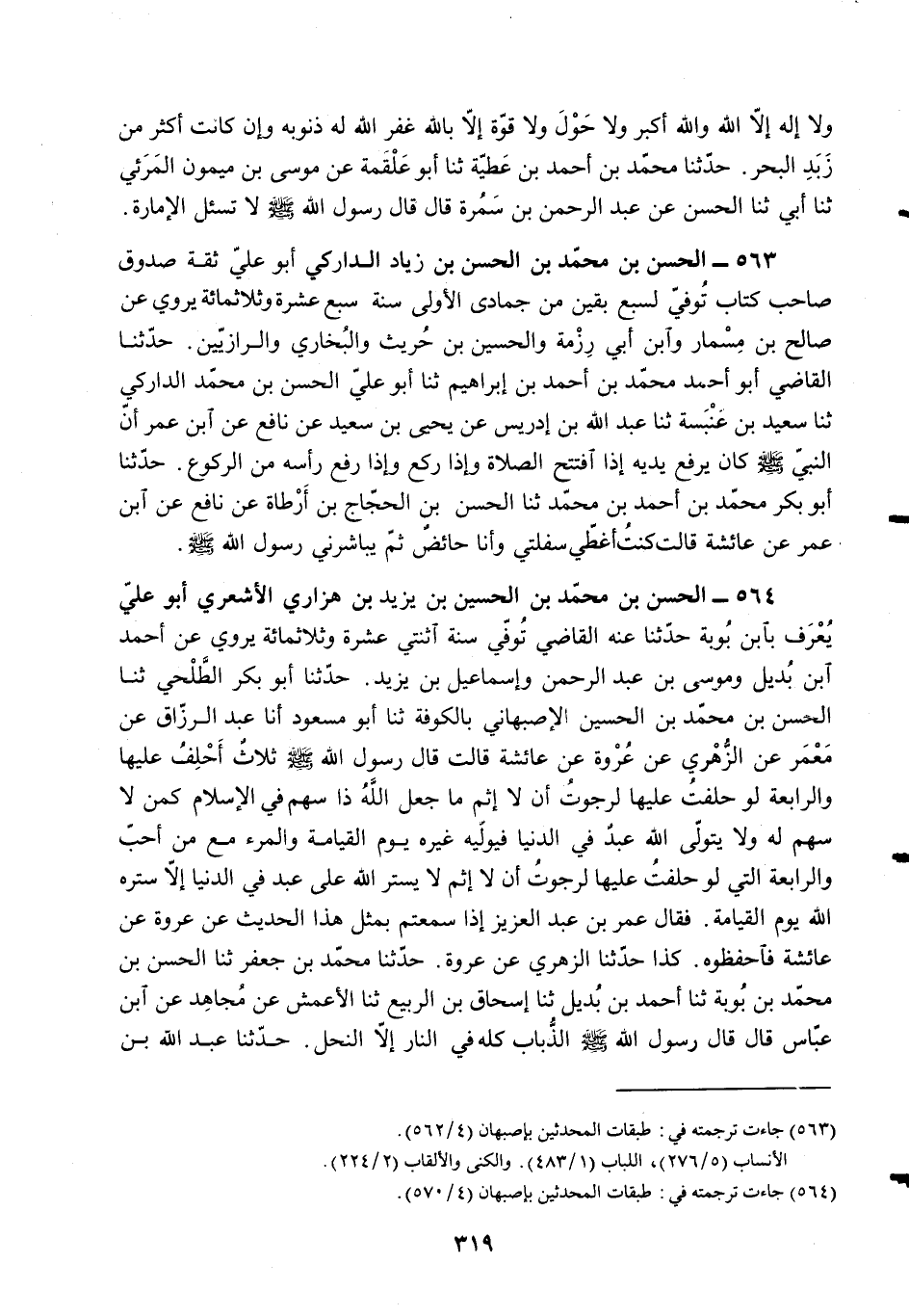 §563 - الْحَسَنُ بْنُ مُحَمَّدِ بْنِ الْحَسَنِ بْنِ زِيَادٍ الدَّارَكِيُّ أَبُو عَلِيٍّ ثِقَةٌ صَدُوقٌ، صَاحِبُ كِتَابٍ، تُوُفِّيَ لِسَبْعٍ بَقِينَ مِنْ جُمَادَى الْأُولَى سَنَةَ سَبْعَ عَشْرَةَ وَثَلَاثِ مِائَةَ، يَرْوِي عَنْ صَالِحِ بْنِ مِسْمَارٍ، وَابْنِ أَبِي رِزْمِةَ، وَالْحُسَيْنِ بْنِ حُرَيْثٍ، وَالْبُخَارِيِّ، وَالرَّازِيِّينَ