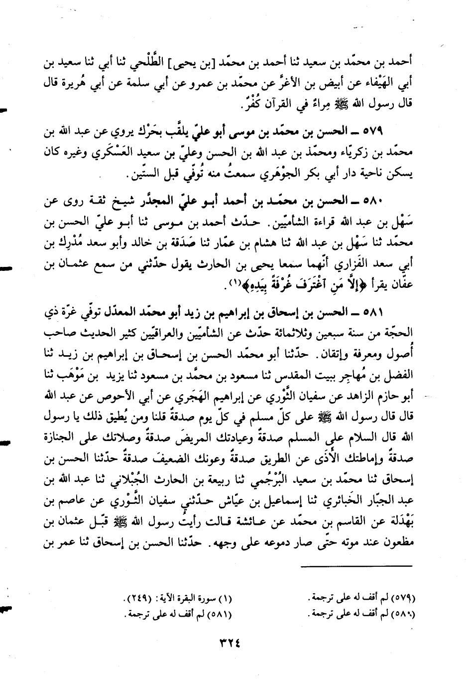 §581 - الْحَسَنُ بْنُ إِسْحَاقَ بْنِ إِبْرَاهِيمَ بْنِ زَيْدٍ أَبُو مُحَمَّدٍ الْمُعَدِّلُ تُوُفِّيَ غُرَّةَ ذِي الْحِجَّةِ مِنْ سَنَةِ سَبْعِينَ وَثَلَاثِ مِائَةٍ، حَدَّثَ عَنِ الشَّأْمِيِّينَ وَالْعِرَاقِيِّينَ، كَثِيرُ الْحَدِيثِ، صَاحِبُ أُصُولٍ وَمَعْرِفَةٍ وَإِتْقَانٍ