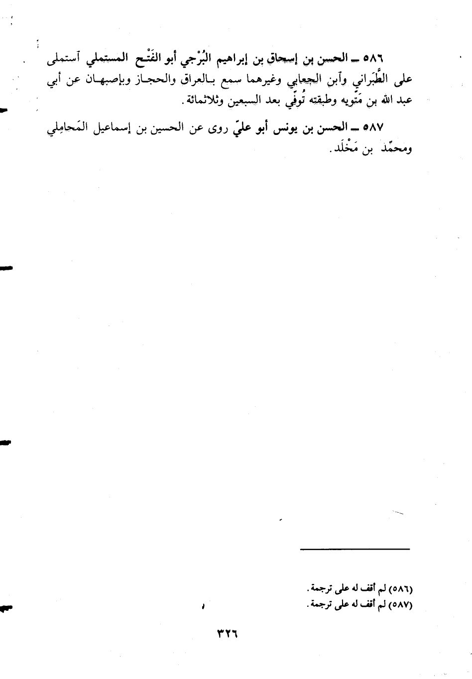 §586 - الْحَسَنُ بْنُ إِسْحَاقَ بْنِ إِبْرَاهِيمَ الْبُرْجِيُّ أَبُو الْفَتْحِ الْمُسْتَمْلِيُّ اسْتَمْلَى عَلَى الطَّبَرَانِيِّ، وَابْنِ الْجُعَابِيِّ وَغَيْرِهِمَا سَمِعَ بِالْعِرَاقِ، وَالْحِجَازِ، وَبِأَصْبَهَانَ عَنْ أَبِي عَبْدِ اللَّهِ بْنِ مَتَّوَيْهِ وَطَبَقَتِهِ، تُوُفِّيَ بَعْدَ السَّبْعِينَ وَثَلَاثِ مِائَةٍ