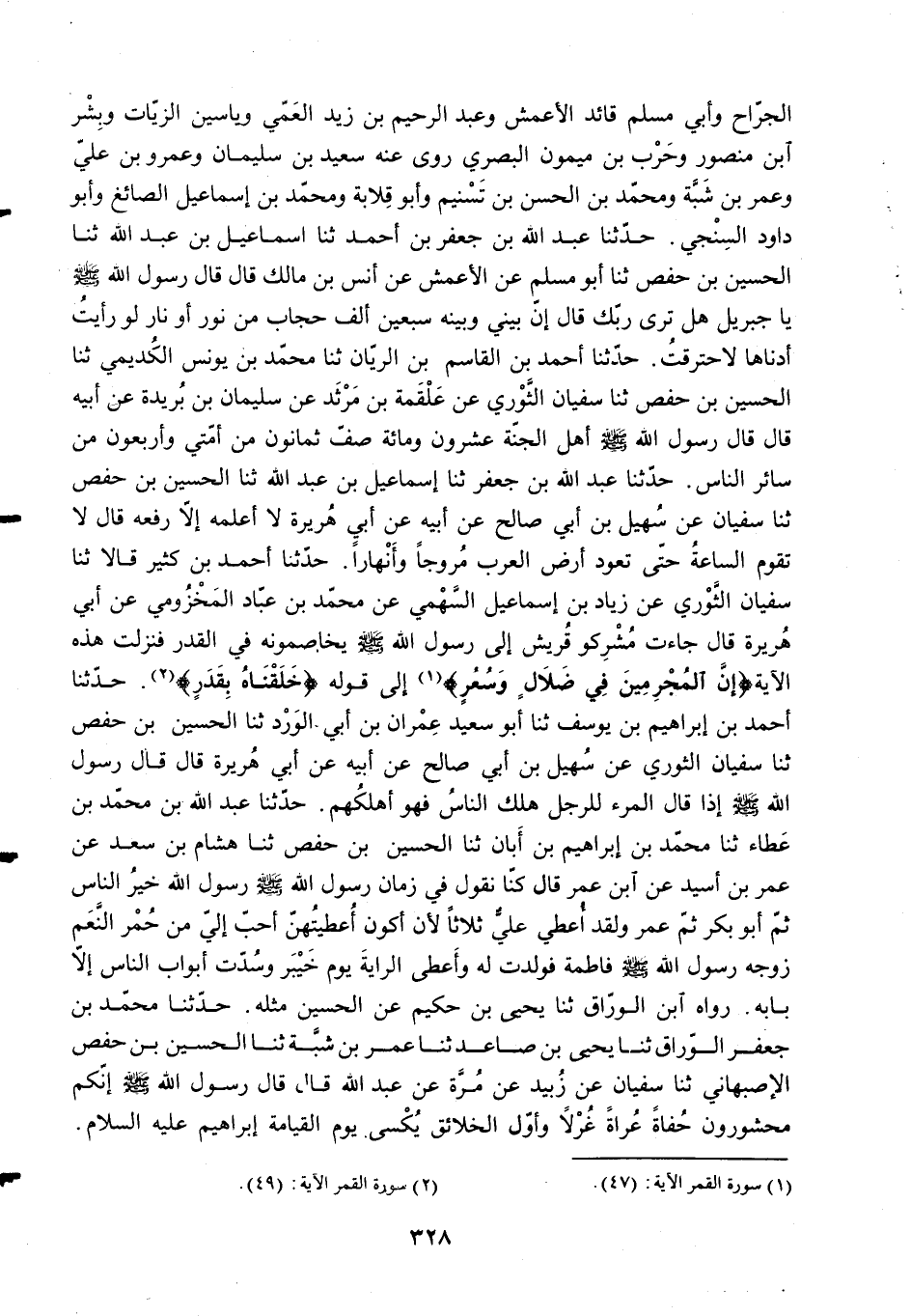 حَدَّثَنَا مُحَمَّدُ بْنُ جَعْفَرٍ الْوَرَّاقُ، ثنا يَحْيَى بْنُ صَاعِدٍ، ثنا عُمَرُ بْنُ شَبَّةَ، ثنا الْحُسَيْنُ بْنُ حَفْصٍ الْأَصْبَهَانِيُّ، ثنا سُفْيَانُ، عَنْ زُبَيْدٍ، عَنْ مُرَّةَ، عَنْ عَبْدِ اللَّهِ، قَالَ: قَالَ رَسُولُ اللَّهِ صَلَّى اللهُ عَلَيْهِ وَسَلَّمَ: §«إِنَّكُمْ مَحْشُورُونَ حُفَاةً عُرَاةً غُرْلًا، وَأَوَّلُ الْخَلَائِقِ يُكْسَى يَوْمَ الْقِيَامَةِ إِبْرَاهِيمُ عَلَيْهِ السَّلَامُ»