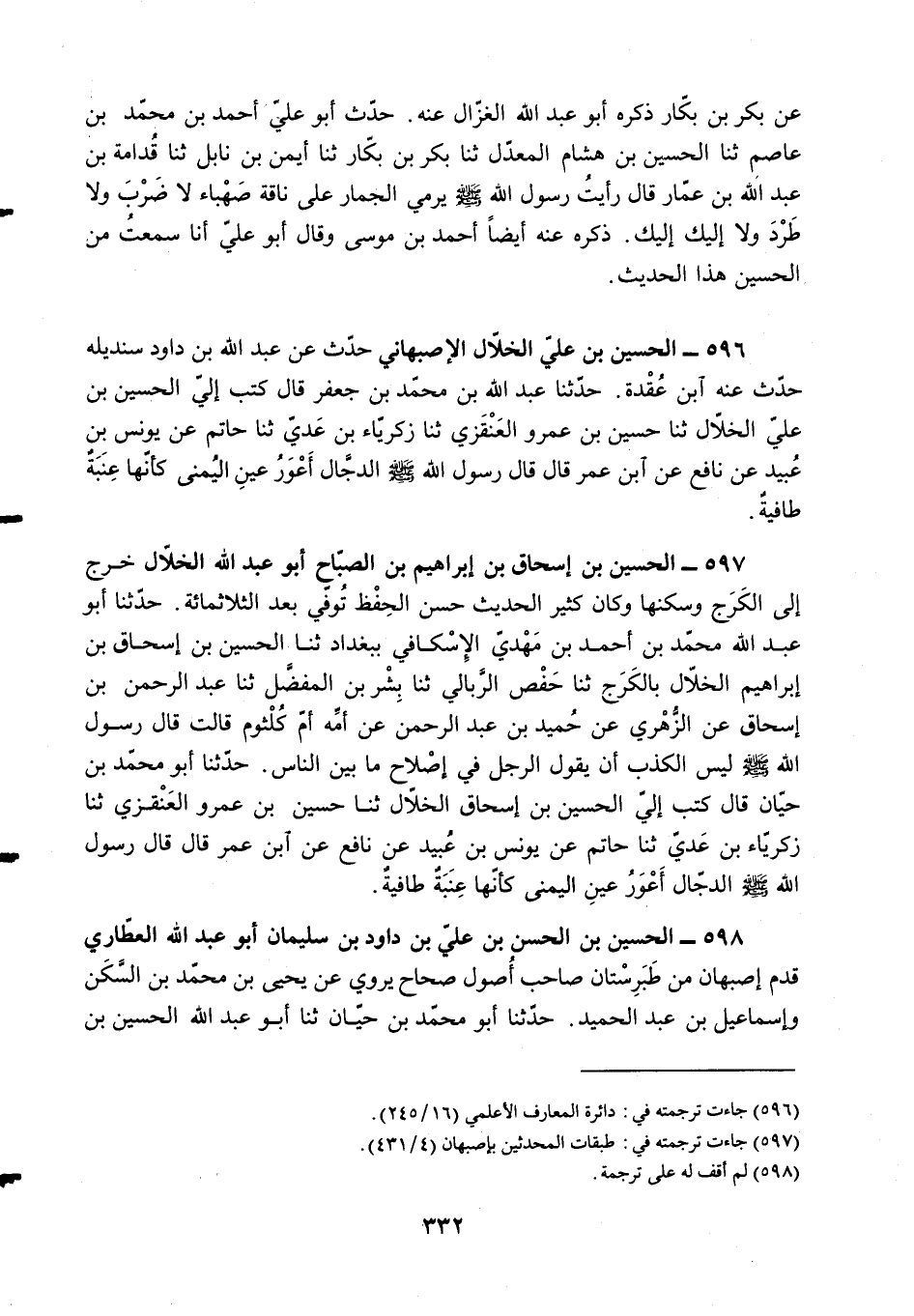 §597 - الْحُسَيْنُ بْنُ إِسْحَاقَ بْنِ إِبْرَاهِيمَ بْنِ الصَّبَّاحِ أَبُو عَبْدِ اللَّهِ الْخَلَّالُ خَرَجَ إِلَى الْكَرْجِ وَسَكَنَهَا، وَكَانَ كَثِيرَ الْحَدِيثِ، حَسَنَ الْحِفْظِ، تُوُفِّيَ بَعْدَ الثَّلَاثِ مِائَةِ