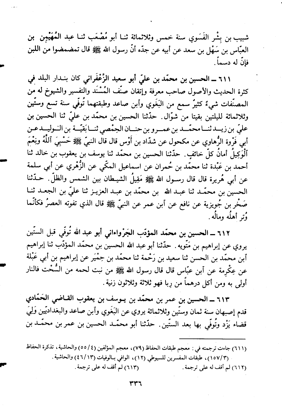 §611 - الْحُسَيْنُ بْنُ مُحَمَّدِ بْنِ عَلِيٍّ أَبُو سَعِيدٍ الزَّعْفَرَانِيُّ كَانَ بُنْدَارَ الْبَلَدِ فِي كَثْرَةِ الْحَدِيثِ وَالْأُصُولِ، صَاحِبُ مَعْرِفَةٍ وَإِتْقَانٍ، صَنَّفَ الْمُسْنَدَ، وَالتَّفْسِيرِ، وَالشُّيُوخَ، لَهُ مِنَ الْمُصَنَّفَاتِ شَيْءٌ كَثِيرٌ، سَمِعَ مِنَ الْبَغَوِيِّ، وَابْنِ صَاعِدٍ، وَطَبَقَتِهِمَا. تُوُفِّيَ سَنَةَ تِسْعٍ وَسِتِّينَ وَثَلَاثِ مِائَةٍ لِلَيْلَتَيْنِ بَقِيَتَا مِنْ شَوَّالٍ