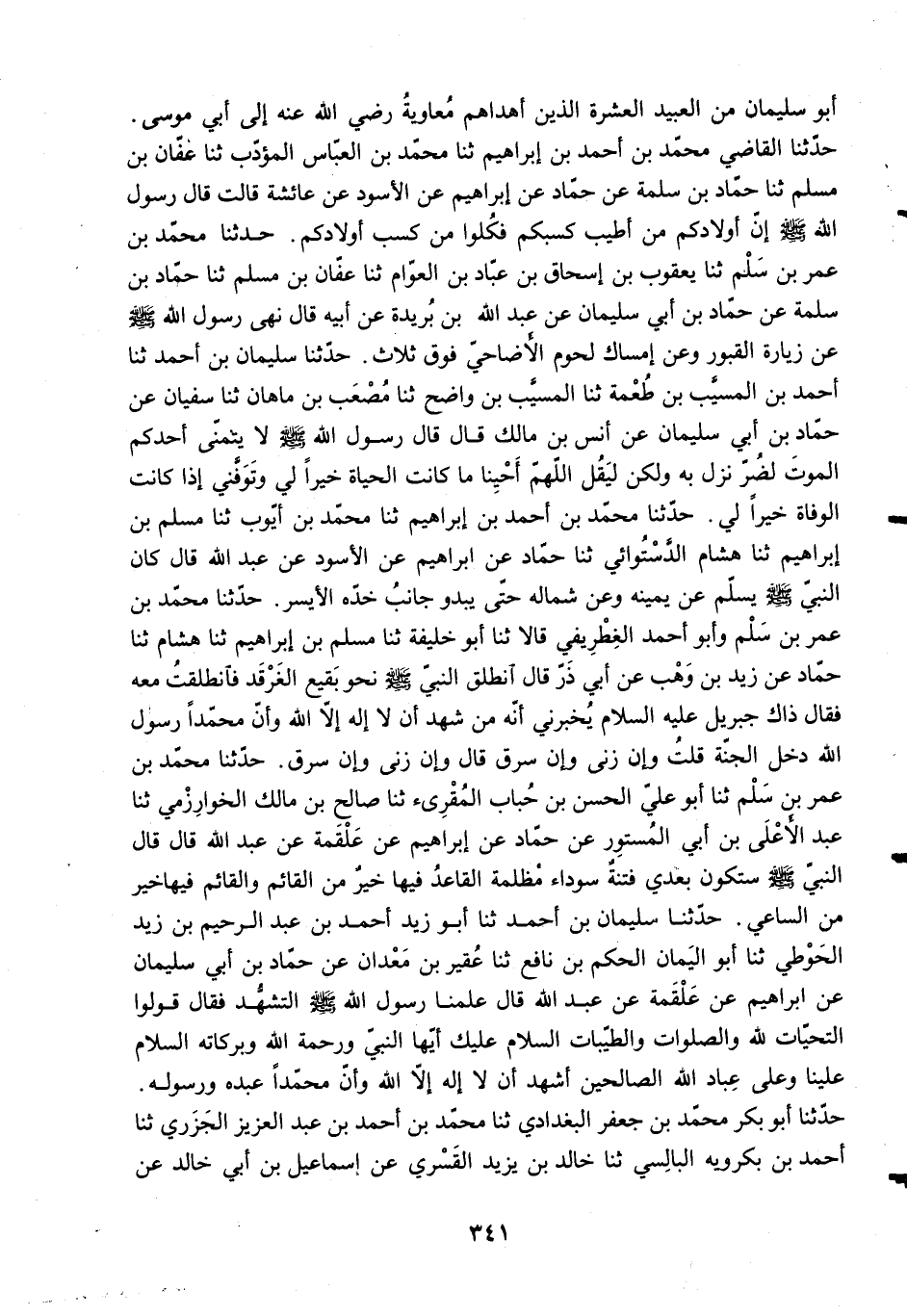 حَدَّثَنَا مُحَمَّدُ بْنُ أَحْمَدَ بْنِ إِبْرَاهِيمَ، ثنا مُحَمَّدُ بْنُ أَيُّوبَ، ثنا مُسْلِمُ بْنُ إِبْرَاهِيمَ، ثنا هِشَامٌ الدَّسْتُوَائِيُّ، ثنا حَمَّادٌ، عَنْ إِبْرَاهِيمَ، عَنِ الْأَسْوَدِ، عَنْ عَبْدِ اللَّهِ، قَالَ: «كَانَ النَّبِيُّ صَلَّى اللهُ عَلَيْهِ وَسَلَّمَ §يُسَلِّمُ عَنْ يَمِينِهِ وَعَنْ شِمَالِهِ حَتَّى يَبْدُوَ جَانِبُ خَدِّهِ الْأَيْسَرِ»