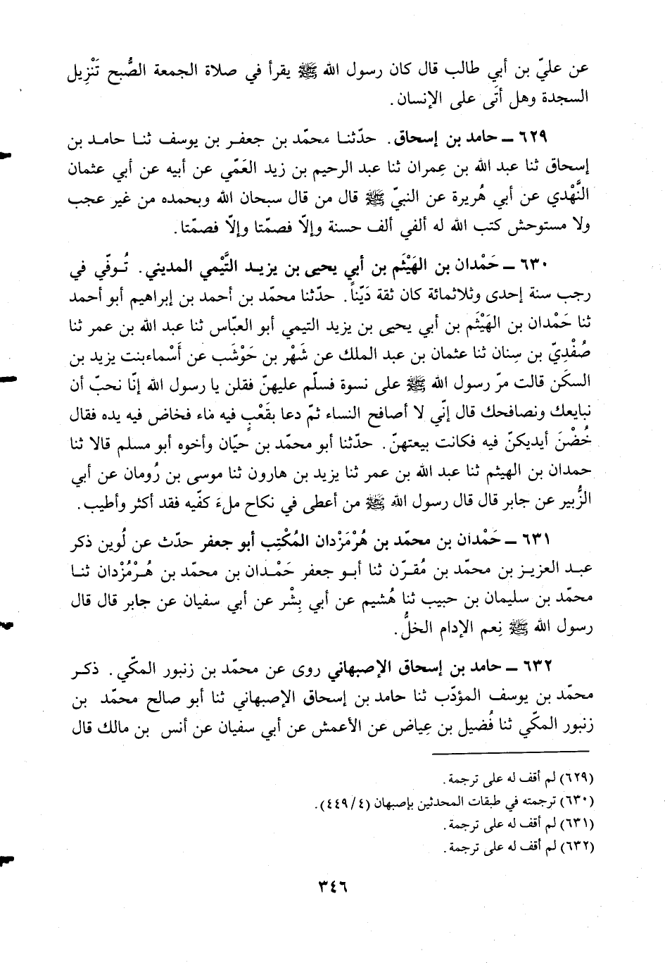 §630 - حَمْدَانُ بْنُ الْهَيْثَمِ بْنِ أَبِي يَحْيَى بْنِ يَزِيدَ التَّيْمِيُّ الْمَدِينِيُّ تُوُفِّيَ فِي رَجَبٍ سَنَةَ إِحْدَى وَثَلَاثِ مِائَةٍ، كَانَ ثِقَةً دَيِّنًا