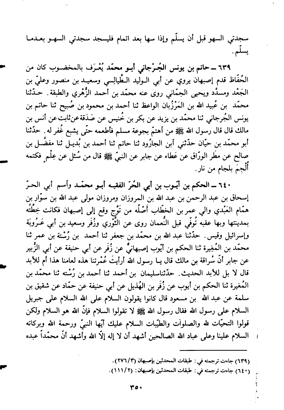 §639 - حَاتِمُ بْنُ يُونُسَ الْجُرْجَانِيُّ أَبُو مُحَمَّدٍ يُعْرَفُ بِالْمَخْضُوبِ كَانَ مِنَ الْحُفَّاظِ، قَدِمَ أَصْبَهَانَ، يَرْوِي عَنْ أَبِي الْوَلِيدِ الطَّيَالِسِيِّ، وَسَعِيدِ بْنِ مَنْصُورٍ، وَعَلِيِّ بْنِ الْجَعْدِ، وَمُسَدَّدٍ، وَيَحْيَى الْحِمَّانِيِّ، رَوَى عَنْهُ مُحَمَّدُ بْنُ أَحْمَدَ الزُّهْرِيُّ وَالطَّبَقَةُ