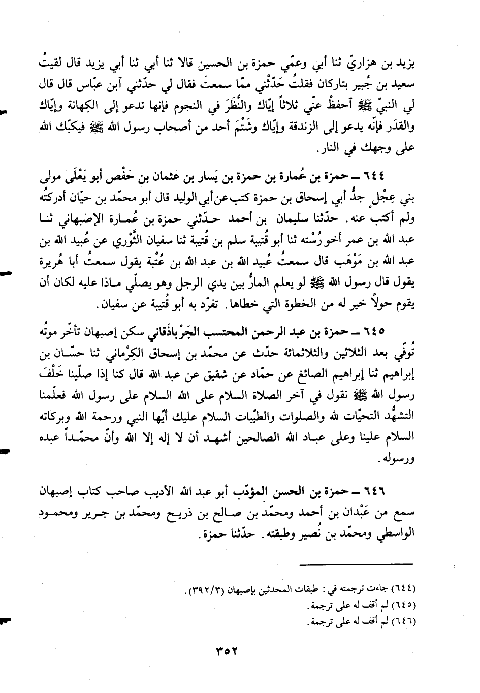 §646 - حَمْزَةُ بْنُ الْحَسَنِ الْمُؤَدِّبُ أَبُو عَبْدِ اللَّهِ الْأَدِيبُ صَاحِبُ كِتَابِ أَصْبَهَانَ، سَمِعَ مِنَ عَبْدَانَ بْنِ أَحْمَدَ، وَمُحَمَّدِ بْنِ صَالِحِ بْنِ ذَرِيحٍ، وَمُحَمَّدِ بْنِ جَرِيرٍ، وَمَحْمُودٍ الْوَاسِطِيِّ، وَمُحَمَّدِ بْنِ نُصَيْرٍ وَطَبَقَتِهِ، حَدَّثَنَا حَمْزَةُ