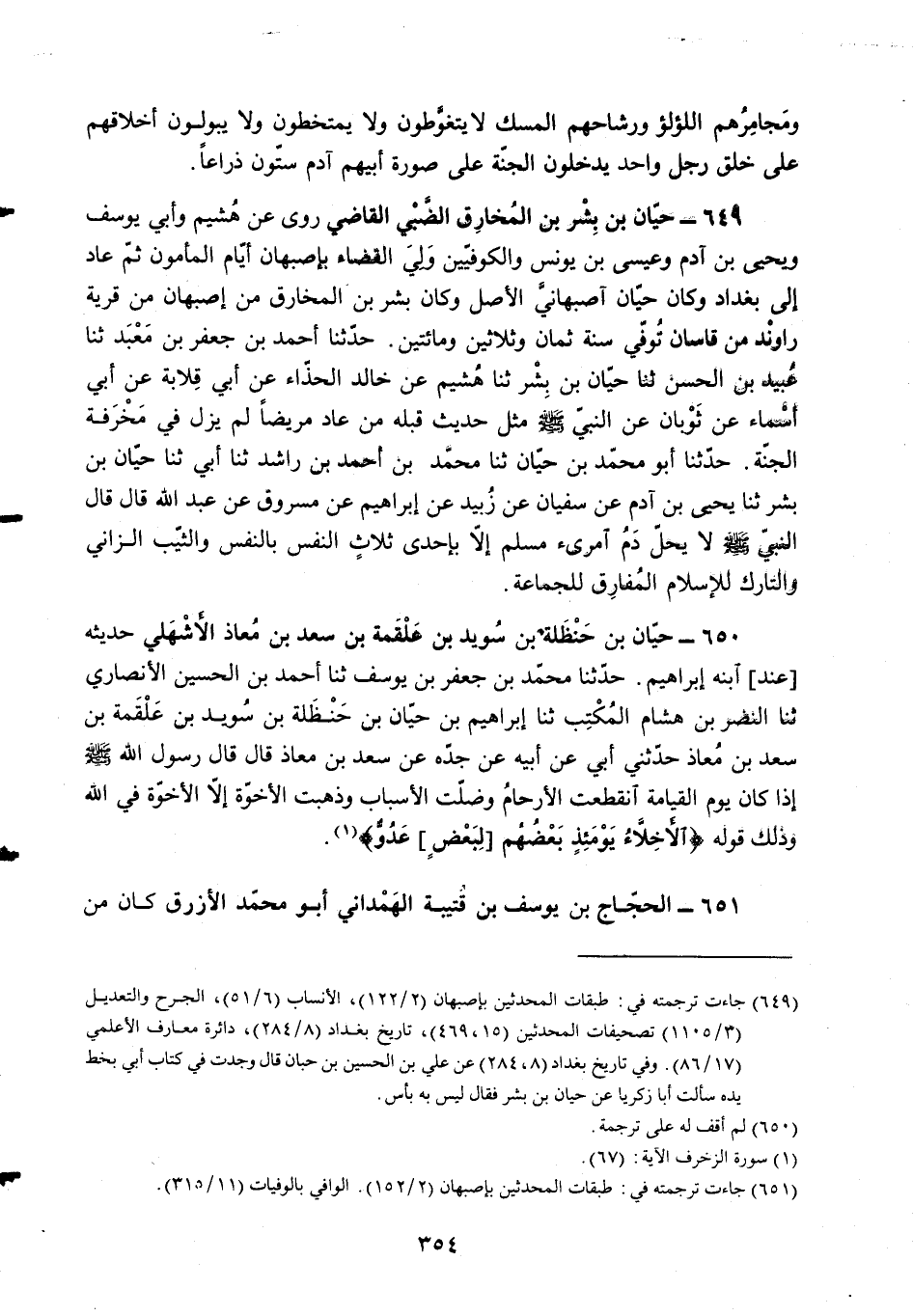 §649 - حَيَّانُ بْنُ بِشْرِ بْنِ الْمُخَارِقِ الضَّبِّيُّ الْقَاضِي رَوَى عَنْ هُشَيْمٍ، وَأَبِي يُوسُفَ، وَيَحْيَى بْنِ آدَمَ، وَعِيسَى بْنِ يُونُسَ، وَالْكُوفِيِّينَ، وَلِيَ الْقَضَاءَ بأَصْبَهَانَ أَيَّامَ الْمَأْمُونِ ثُمَّ عَادَ إِلَى بَغْدَادَ وَكَانَ حَيَّانُ أَصْبَهَانِيَّ الْأَصْلِ وَكَانَ بِشْرُ بْنُ الْمُخَارِقِ مِنْ أَصْبَهَانَ مِنْ قَرْيَةِ رَاوِنْدَ مِنْ قَاسَانَ تُوُفِّيَ سَنَةَ ثَمَانٍ وَثَلَاثِينَ وَمِائَتَيْنِ