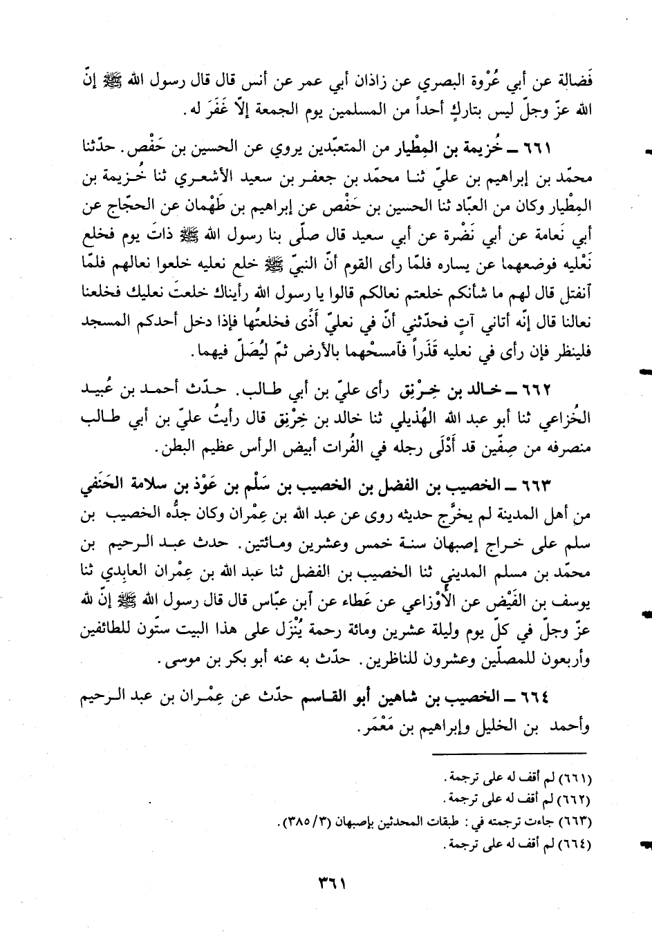 حَدَّثَنَا مُحَمَّدُ بْنُ إِبْرَاهِيمَ بْنِ عَلِيٍّ، ثنا مُحَمَّدُ بْنُ جَعْفَرِ بْنِ سَعِيدٍ الْأَشْعَرِيُّ، ثنا خُزَيْمَةُ بْنُ الْمِطْيَارِ وَكَانَ مِنَ الْعُبَّادِ، ثنا الْحُسَيْنُ بْنُ حَفْصٍ، عَنْ إِبْرَاهِيمَ بْنِ طَهْمَانَ، عَنِ الْحَجَّاجِ، عَنْ أَبِي نَعَامَةَ، عَنْ أَبِي نَضْرَةَ، عَنْ أَبِي سَعِيدٍ، قَالَ: صَلَّى بِنَا رَسُولُ اللَّهِ صَلَّى اللهُ عَلَيْهِ وَسَلَّمَ ذَاتَ يَوْمٍ فَخَلَعَ نَعْلَيْهِ فَوَضَعَهُمَا عَنْ يَسَارِهِ، فَلَمَّا رَأَى الْقَوْمُ أَنَّ النَّبِيَّ صَلَّى اللهُ عَلَيْهِ وَسَلَّمَ خَلَعَ نَعْلَيْهِ خَلَعُوا نِعَالَهُمْ، فَلَمَّا انْفَتَلَ قَالَ لَهُمْ: مَا شَأْنُكُمْ خَلَعْتُمْ نِعَالَكُمْ؟ قَالُوا: يَا رَسُولَ اللَّهِ، رَأَيْنَاكَ خَلَعْتَ نَعْلَيْكَ فَخَلَعْنَا نِعَالَنَا. قَالَ: «إِنَّهُ §أَتَانِي آتٍ فَحَدَّثَنِي أَنَّ فِي نَعْلَيَّ أَذًى فَخَلَعْتُهَا، فَإِذَا دَخَلَ أَحَدُكُمُ الْمَسْجِدَ فَلْيَنْظُرْ، فَإِنْ رَأَى فِي نَعْلَيْهِ قَذَرًا فَلْيَمْسَحْهُمَا بِالْأَرْضِ، ثُمَّ لِيُصَلِّ فِيهِمَا»