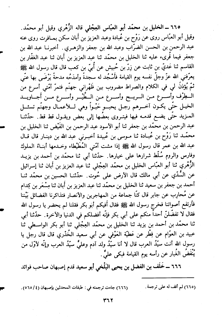 §665 - الْخَلِيلُ بْنُ مُحَمَّدٍ أَبُو الْعَبَّاسِ الْعِجْلِيُّ قَالَهُ الزُّهْرِيُّ وَقِيلَ: أَبُو مُحَمَّدٍ وَقِيلَ: أَبُو الْعَبَّاسِ، رَوَى عَنْ رَوْحِ بْنِ عُبَادَةَ، وَعَبْدِ الْعَزِيزِ بْنِ أَبَانَ، سَكَنَ بِمَافَرْتَ، رَوَى عَنْهُ عَبْدُ الرَّحْمَنِ بْنُ الْحَسَنِ الضِّرَابُ، وَعَبْدُ اللَّهِ بْنُ جَعْفَرٍ، وَالزُّهْرِيُّ