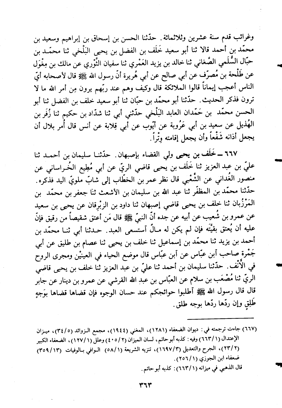 حَدَّثَنَا الْحَسَنُ بْنُ إِسْحَاقَ بْنِ إِبْرَاهِيمَ، وَسَعِيدُ بْنُ مُحَمَّدِ بْنِ أَحْمَدَ، قَالَا: ثنا أَبُو سَعِيدٍ خَلَفُ بْنُ الْفَضْلِ بْنِ يَحْيَى الْبَلْخِيُّ، ثنا مُحَمَّدُ بْنُ حِبَالٍ السُّلَمِيُّ الصَّغَانِيُّ، ثنا خَالِدُ بْنُ يَزِيدَ الْعُمَرِيُّ، ثنا سُفْيَانُ الثَّوْرِيُّ، عَنْ مَالِكِ بْنِ مِغْوَلٍ، عَنْ طَلْحَةَ بْنِ مُصَرِّفٍ، عَنْ أَبِي صَالِحٍ، عَنْ أَبِي هُرَيْرَةَ، أَنَّ رَسُولَ اللَّهِ صَلَّى اللهُ عَلَيْهِ وَسَلَّمَ قَالَ لِأَصْحَابِهِ: «§أَيُّ النَّاسِ أَعْجَبُ إِيمَانًا؟» قَالُوا: الْمَلَائِكَةُ. قَالَ: «وَكَيْفَ وَهُمْ عِنْدَ رَبِّهِمْ، يَرَوْنَ مِنْ أَمْرِ اللَّهِ مَا لَا تَرَوْنَ» فَذَكَرَ الْحَدِيثَ