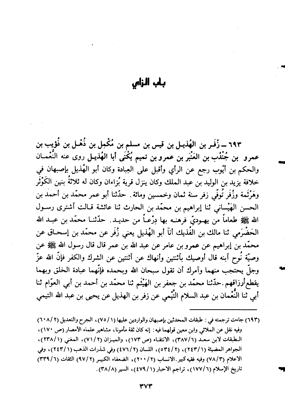 §693 - زُفَرُ بْنُ الْهُذَيْلِ بْنِ قَيْسِ بْنِ مُسْلِمِ بْنِ مُكْمِلِ بْنِ ذُهْلِ بْنِ ذُؤَيْبِ بْنِ عَمْرِو بْنِ جُنْدُبِ بْنِ الْعَنْبَرِ بْنِ عَمْرِو بْنِ تَمِيمٍ، يُكَنَّى أَبَا الْهُذَيْلِ، رَوَى عَنْهُ النُّعْمَانُ، وَالْحَكَمُ بْنُ أَيُّوبَ، رَجَعَ عَنِ الرَّأْيِ، وَأَقْبَلَ عَلَى الْعِبَادَةِ، وَكَانَ أَبُو الْهُذَيْلِ بأَصْبَهَانَ فِي خِلَافَةِ يَزِيدَ بْنِ الْوَلِيدِ بْنِ عَبْدِ الْمَلِكِ، وَكَانَ يَنْزِلُ قَرْيَةَ بُزَاءَانَ، وَكَانَ لَهُ ثَلَاثَةُ بَنِينَ: الْكَوْثَرُ، وَهَرْثَمَةُ، وَزُفَرُ، تُوُفِّيَ زُفَرُ سَنَةِ ثَمَانِ وَخَمْسِينَ وَمِائَةَ