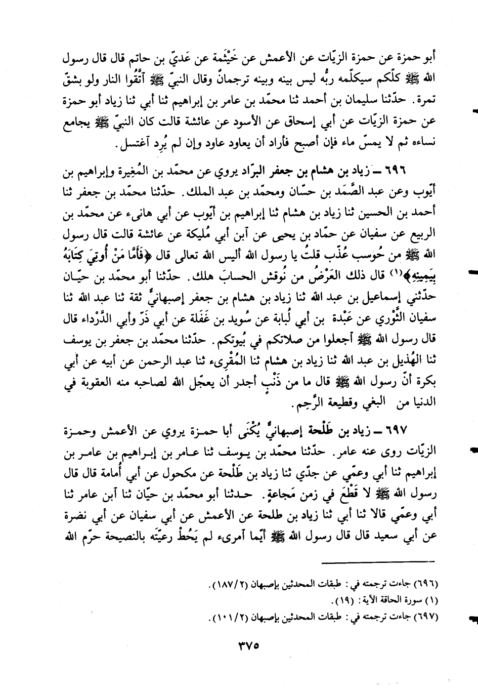 §زِيَادُ بْنُ طَلْحَةَ أَصْبَهَانِيُّ، يُكَنَّى أَبَا حَمْزَةَ، يَرْوِي عَنِ الْأَعْمَشِ، وَحَمْزَةَ الزَّيَّاتِ، رَوَى عَنْهُ عَامِرٌ