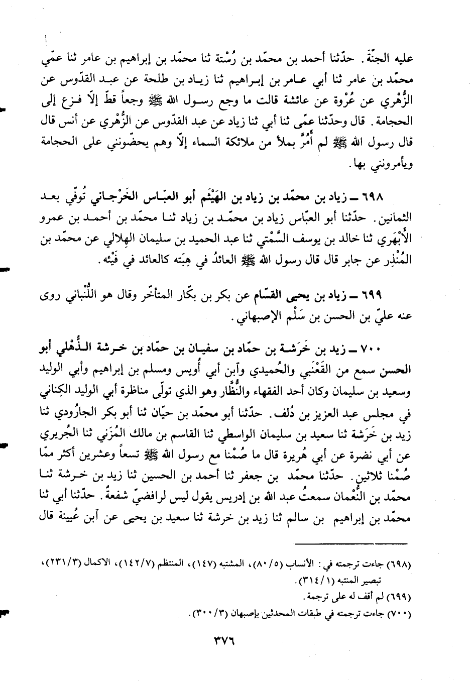 §زَيْدُ بْنُ خَرَشَةَ بْنِ حَمَّادِ بْنِ سُفْيَانَ بْنِ حَمَّادِ بْنِ خَرَشَةَ الذُّهْلِيُّ أَبُو الْحَسَنِ سَمِعَ مِنَ الْقَعْنَبِيِّ، وَالْحُمَيْدِيِّ، وَابْنِ أَبِي أُوَيْسٍ، وَمُسْلِمِ بْنِ إِبْرَاهِيمَ، وَأَبِي الْوَلِيدِ، وَسَعِيدِ بْنِ سُلَيْمَانَ، وَكَانَ أَحَدَ الْفُقَهَاءِ وَالنُّظَّارِ، وَهُوَ الَّذِي تَوَلَّى مُنَاظَرَةِ أَبِي الْوَلِيدِ الْكِنَانِيِّ فِي مَجْلِسِ عَبْدِ الْعَزِيزِ بْنِ دُلَفٍ