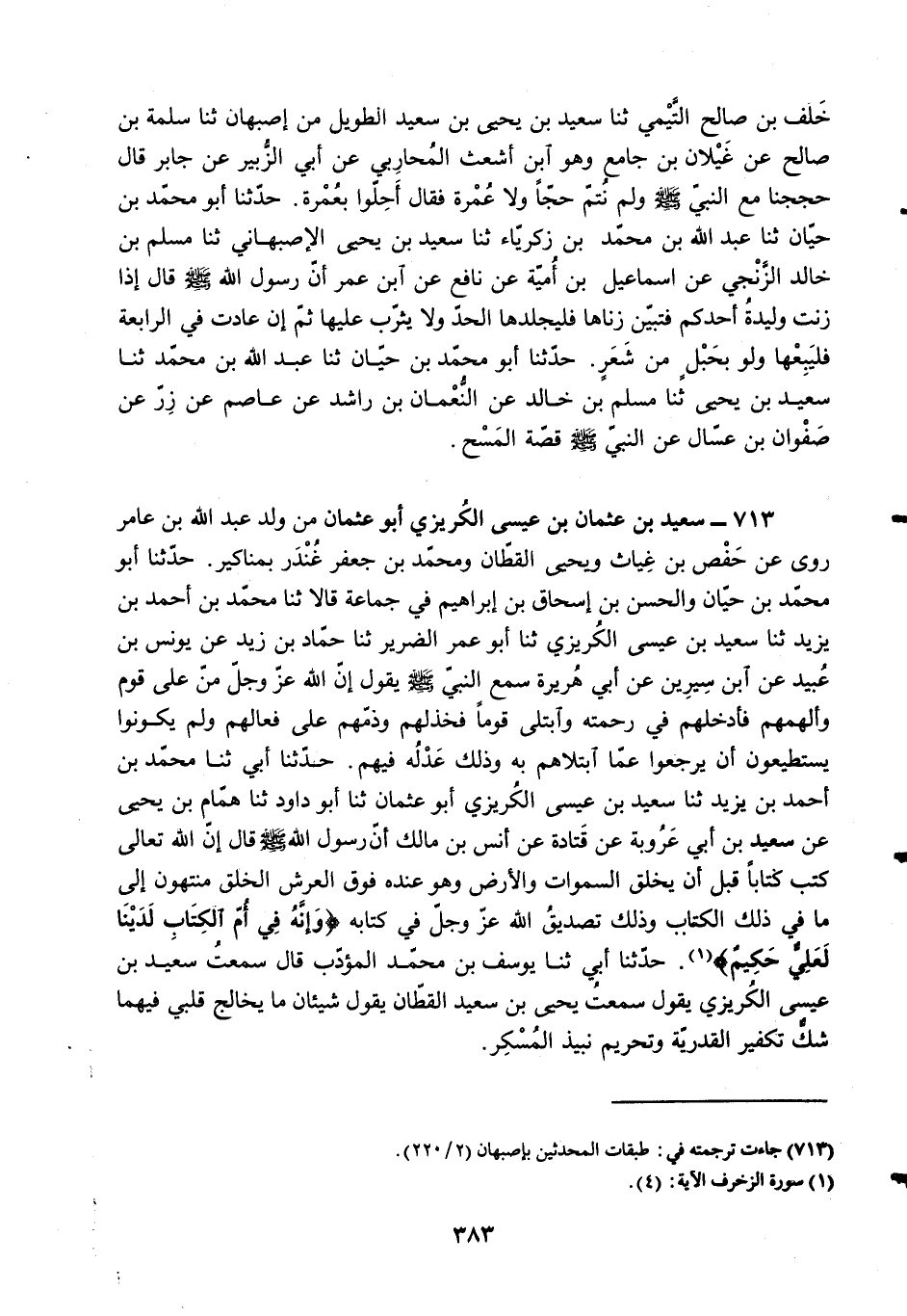 حَدَّثَنَا أَبُو مُحَمَّدِ بْنُ حَيَّانَ، ثنا عَبْدُ اللَّهِ بْنُ مُحَمَّدِ بْنِ زَكَرِيَّاءَ، ثنا سَعِيدُ بْنُ يَحْيَى الْأَصْبَهَانِيُّ، ثنا مُسْلِمُ بْنُ خَالِدٍ الزَّنْجِيُّ، عَنْ إِسْمَاعِيلَ بْنِ أُمَيَّةَ، عَنْ نَافِعٍ، عَنِ ابْنِ عُمَرَ، أَنَّ رَسُولَ اللَّهِ صَلَّى اللهُ عَلَيْهِ وَسَلَّمَ قَالَ: «§إِذَا زَنَتْ وَلِيدَةُ أَحَدِكُمْ فَتَبَيَّنَ زِنَاهَا، فَلْيَجْلِدْهَا الْحَدَّ وَلَا يُثَرِّبْ عَلَيْهَا، ثُمَّ إِنْ عَادَتْ فِي الرَّابِعَةِ فَلْيَبِعْهَا وَلَوْ بِحَبْلٍ مِنْ شَعَرٍ» حَدَّثَنَا أَبُو مُحَمَّدِ بْنُ حَيَّانَ، ثنا عَبْدُ اللَّهِ بْنُ مُحَمَّدٍ، ثنا سَعِيدُ بْنُ يَحْيَى، ثنا مُسْلِمُ بْنُ خَالِدٍ، عَنِ النُّعْمَانِ بْنِ رَاشِدٍ، عَنْ عَاصِمٍ، عَنْ زِرٍّ، عَنْ صَفْوَانَ بْنِ عَسَّالِ، عَنِ النَّبِيِّ صَلَّى اللهُ عَلَيْهِ وَسَلَّمَ قِصَّةِ الْمَسْحِ