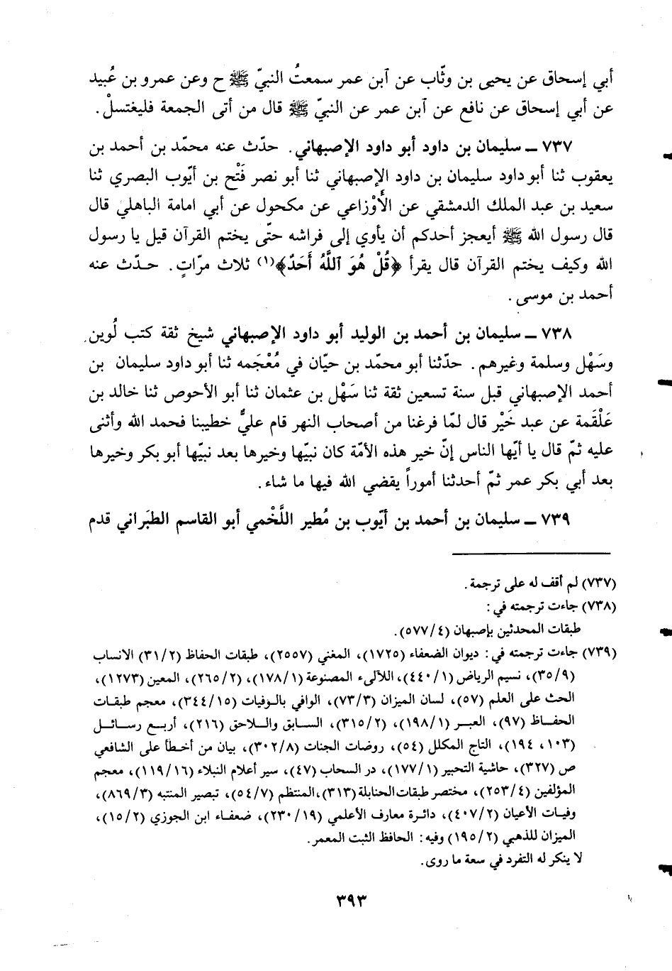 حَدَّثَ، عَنْهُ مُحَمَّدُ بْنُ أَحْمَدَ بْنِ يَعْقُوبَ، ثنا أَبُو دَاوُدَ سُلَيْمَانُ بْنُ دَاوُدَ الْأَصْبَهَانِيُّ، ثنا أَبُو نَصْرٍ فَتْحُ بْنُ أَيُّوبَ الْبَصْرِيُّ، ثنا سَعِيدُ بْنُ عَبْدِ الْمَلِكِ الدِّمَشْقِيُّ، عَنِ الْأَوْزَاعِيِّ، عَنْ مَكْحُولٍ، عَنْ أَبِي أُمَامَةَ الْبَاهِلِيِّ، قَالَ: قَالَ رَسُولُ اللَّهِ صَلَّى اللهُ عَلَيْهِ وَسَلَّمَ: §«أَيَعْجِزُ أَحَدُكُمْ أَنْ يَأْوِيَ إِلَى فِرَاشِهِ حَتَّى يَخْتِمَ الْقُرْآنَ؟» قِيلَ: يَا رَسُولَ اللَّهِ، وَكَيْفَ يُخْتَمُ الْقُرْآنُ؟ قَالَ: " يَقْرَأُ: قُلْ هُوَ اللَّهُ أَحَدٌ ثَلَاثَ مَرَّاتٍ " حَدَّثَ عَنْهُ أَحْمَدُ بْنُ مُوسَى